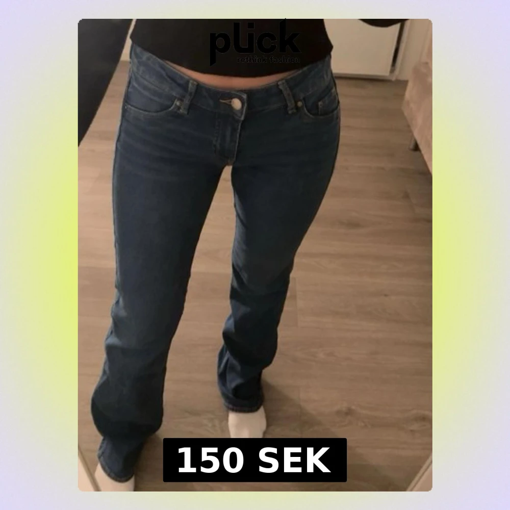 Säljer ett par mörkblå jeans med bootcut passform och låg midja. Klassisk femficksmodell i mjukt denimtyg som sitter snyggt över höfterna och släpper ut vid benen. Perfekta till sneakers eller boots.