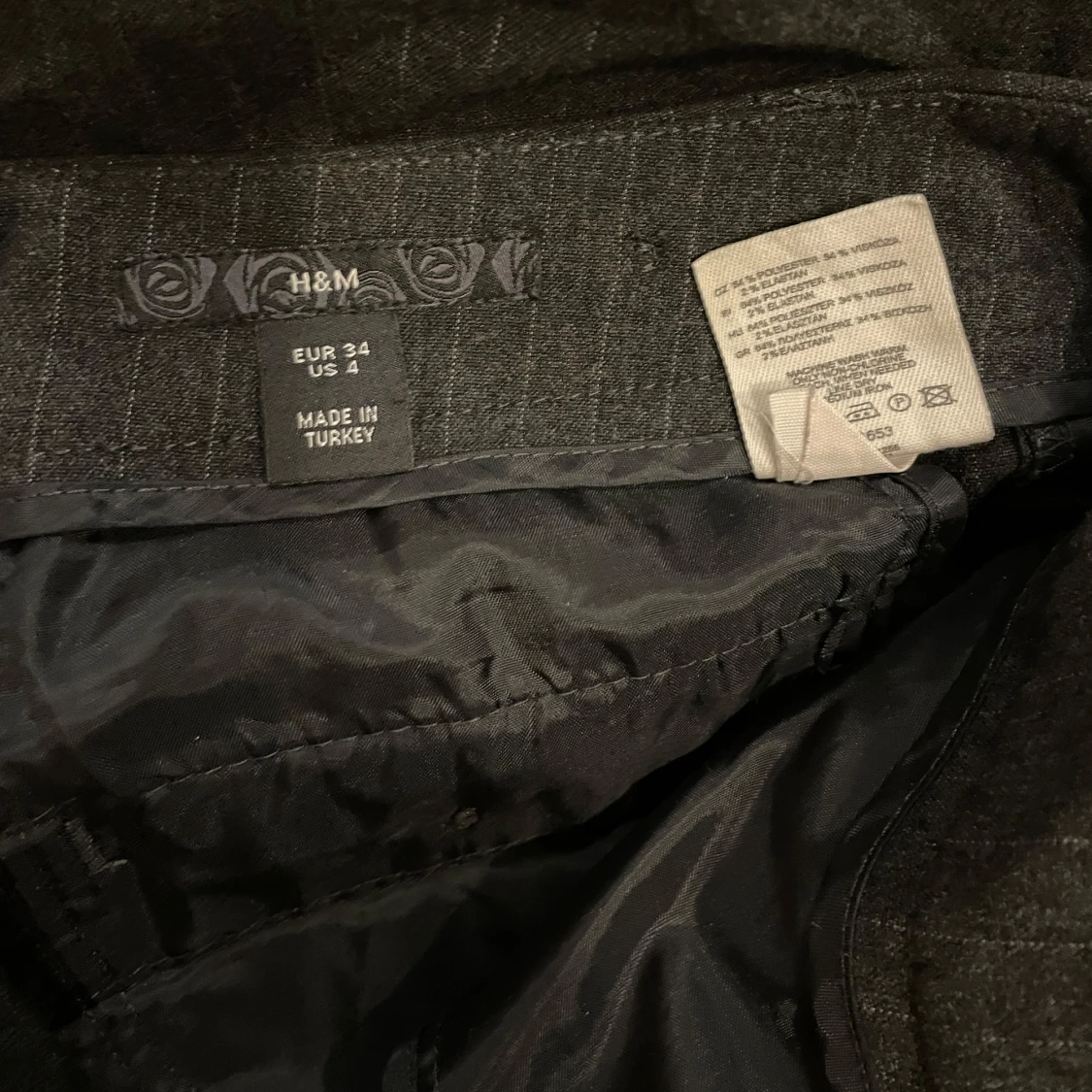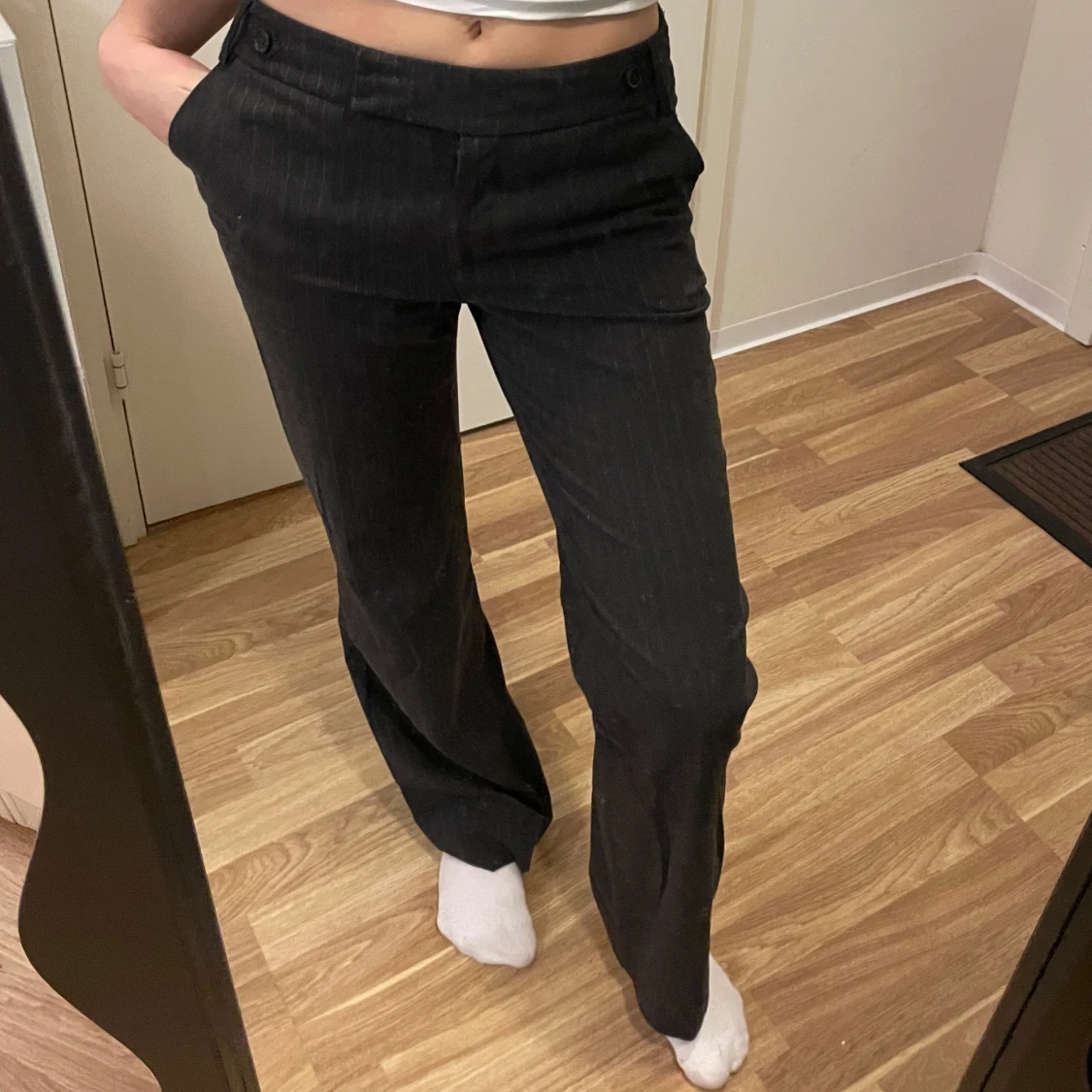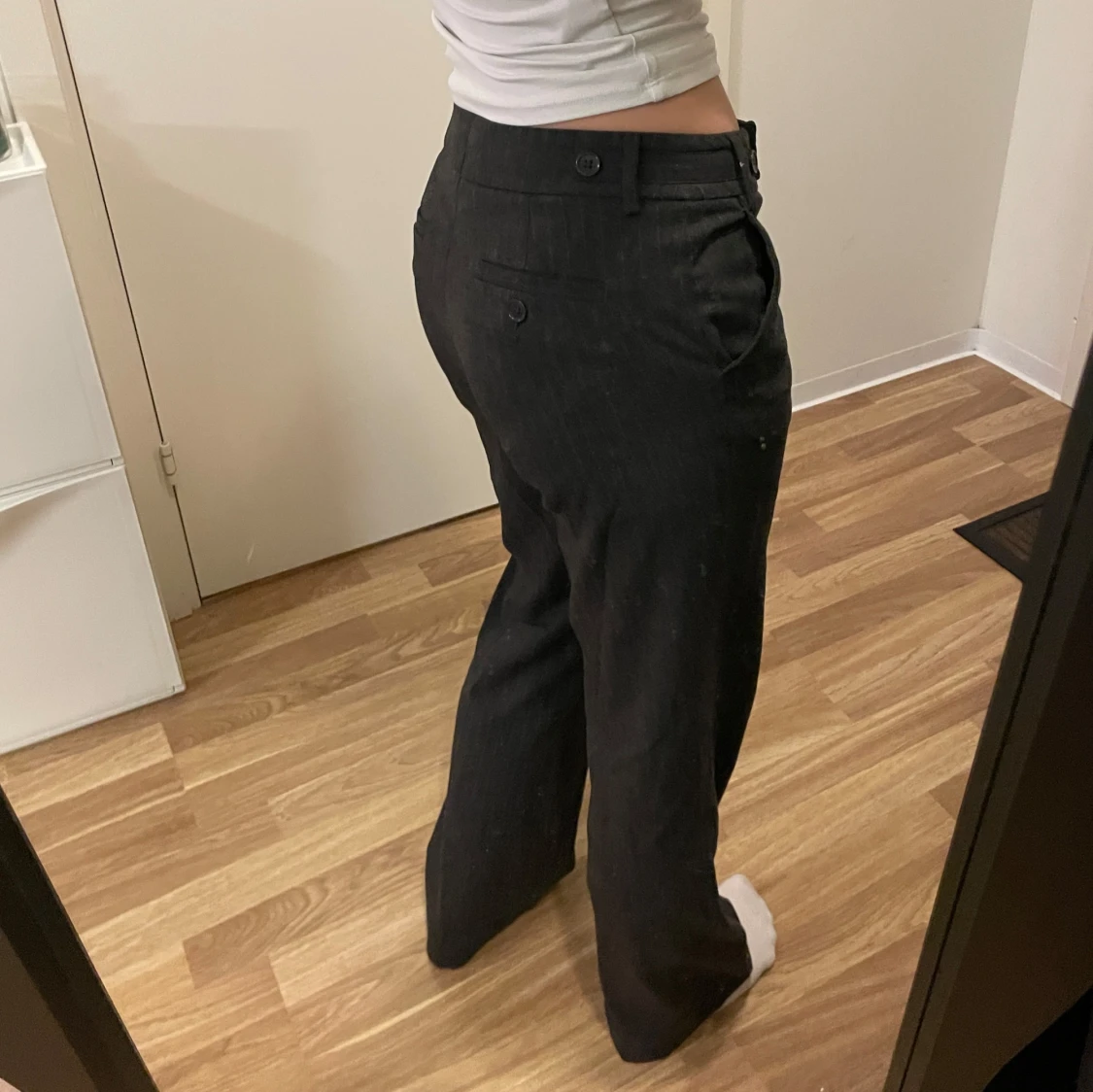 Snygga gråa kostymbyxor från H&M i storlek 34. Byxorna har en klassisk rak passform med diskreta ränder och knappar bak. Lågmidjade. Passar en som är runt 170cm i längden. Jag rullade upp de lite i benen. Jag är 160cm för referens.