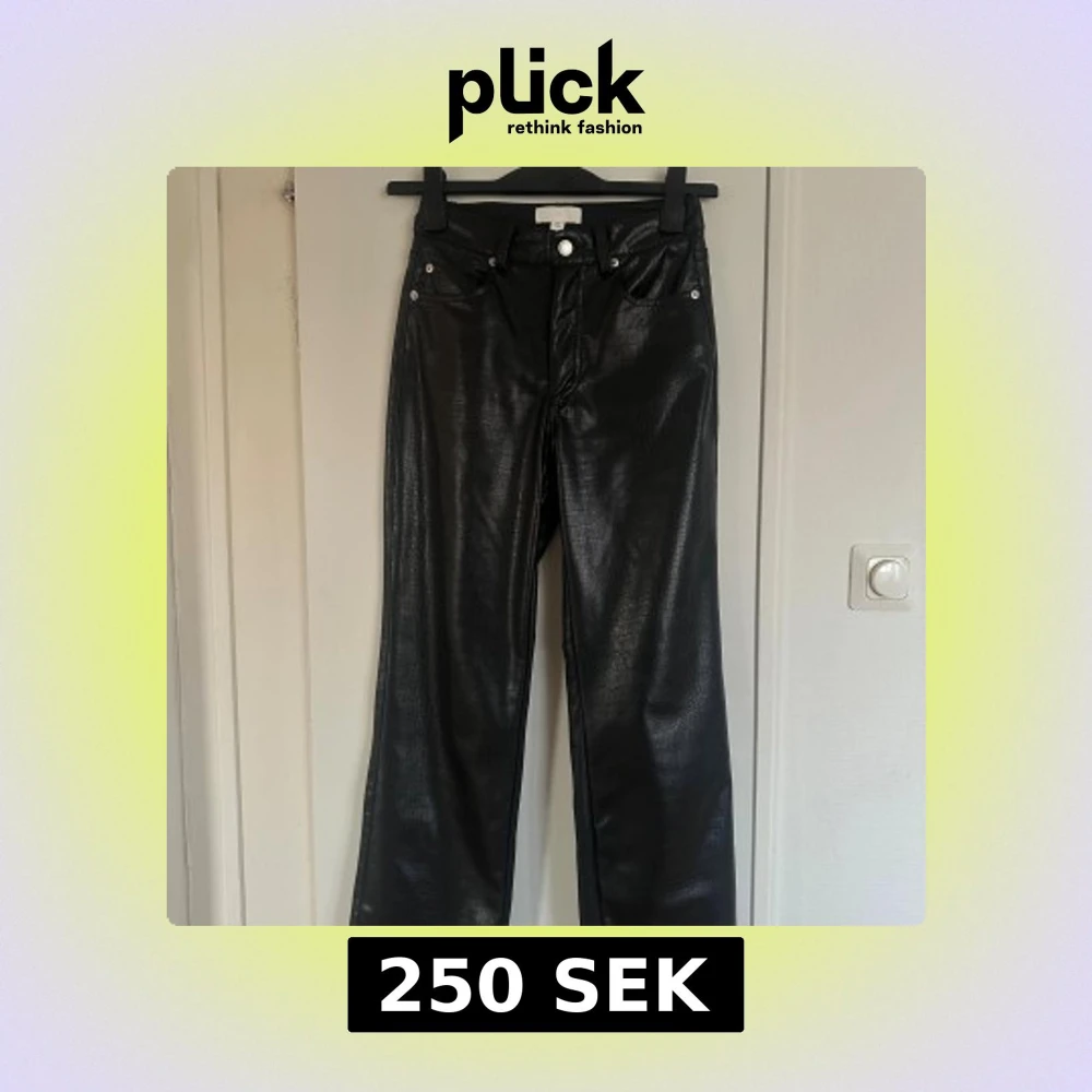 Säljer ett par svarta byxor från H&M i storlek 34 med croc-mönstrad yta. Byxorna har raka ben, normal passform och är gjorda i ett syntetmaterial som ser ut som skinn. Klassisk femficksmodell med bälteshällor och dragkedja.