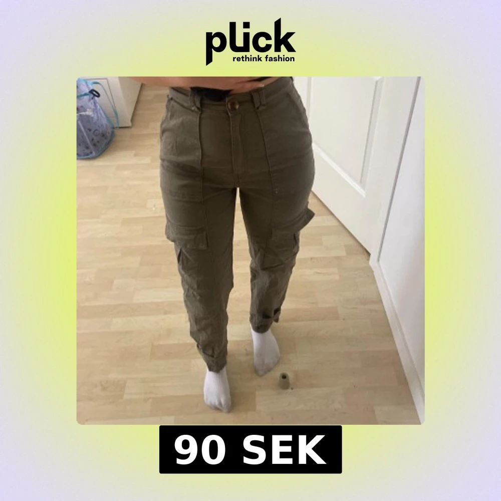 Säljer ett par olivgröna cargopants från H&M i storlek 34. Byxorna är högmidjade med raka ben, sidofickor och klassiska cargofickor på benen. Tillverkade i bomull och har justerbara band vid benslut för en snygg passform.