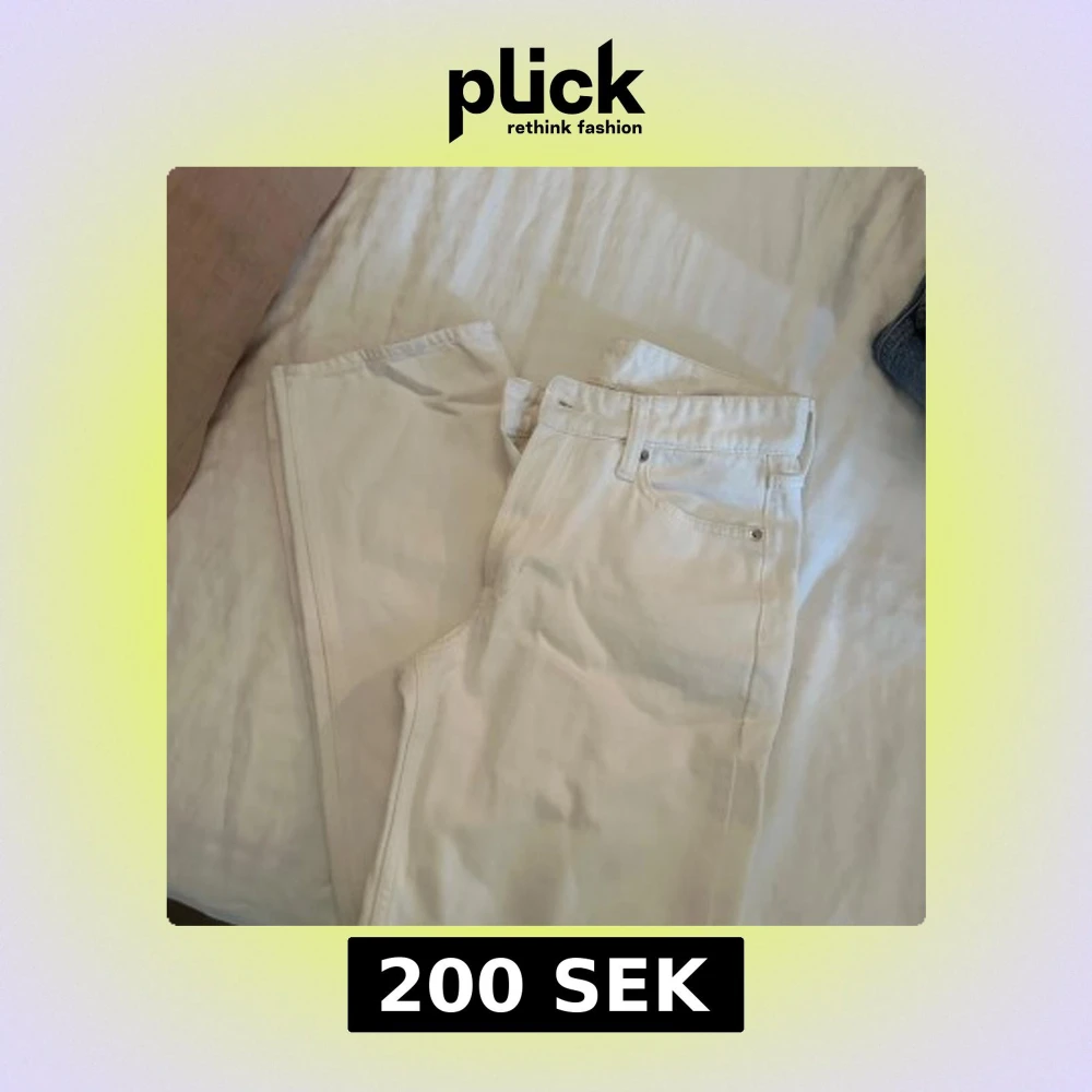 Säljer ett par vita baggy jeans från hm med låg midja. Jeansen har klassisk femficksdesign och raka ben. Perfekta för en avslappnad och trendig look. Materialet är denim och färgen är helt vit.