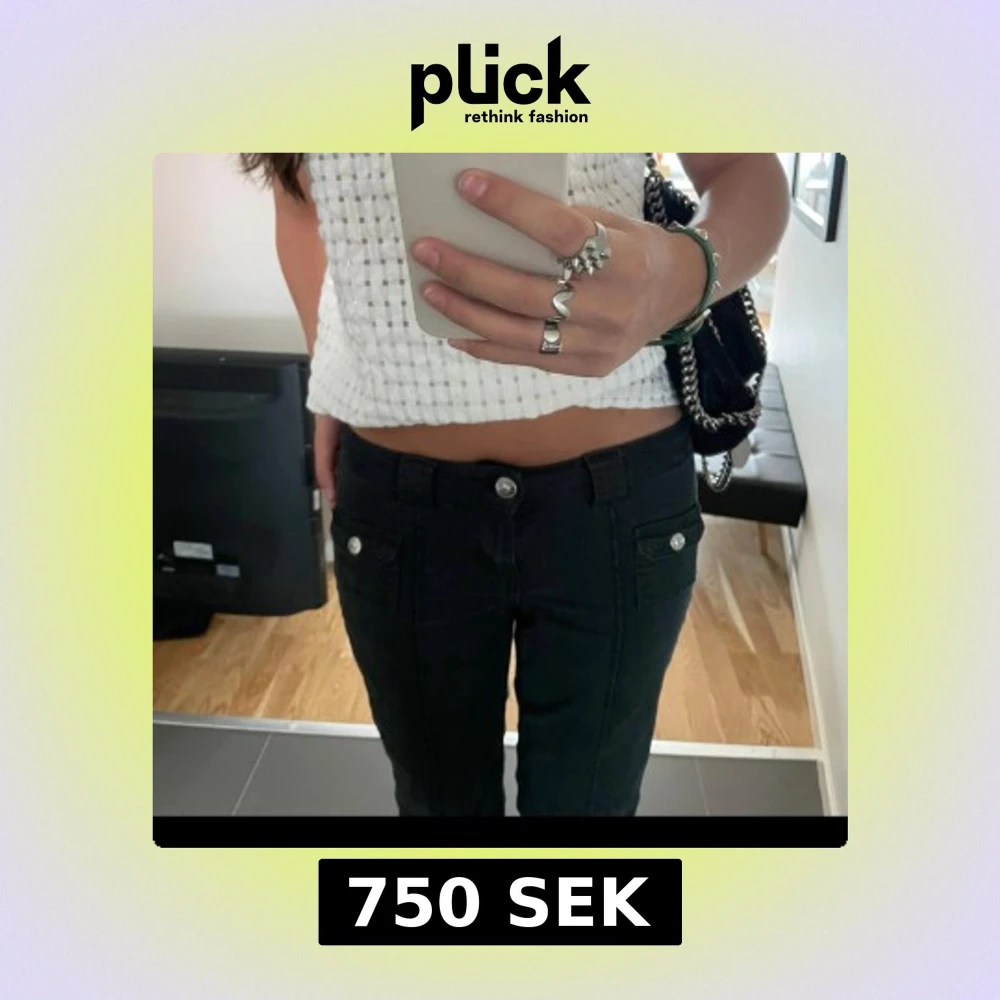 Snygga svarta jeans med låg midja och utsvängda ben. Jeansen har dekorativa knappar på fickorna och en stilren design. Jag är 168 som preferens. Storlek: 36 passar mig som har xs/s!💞