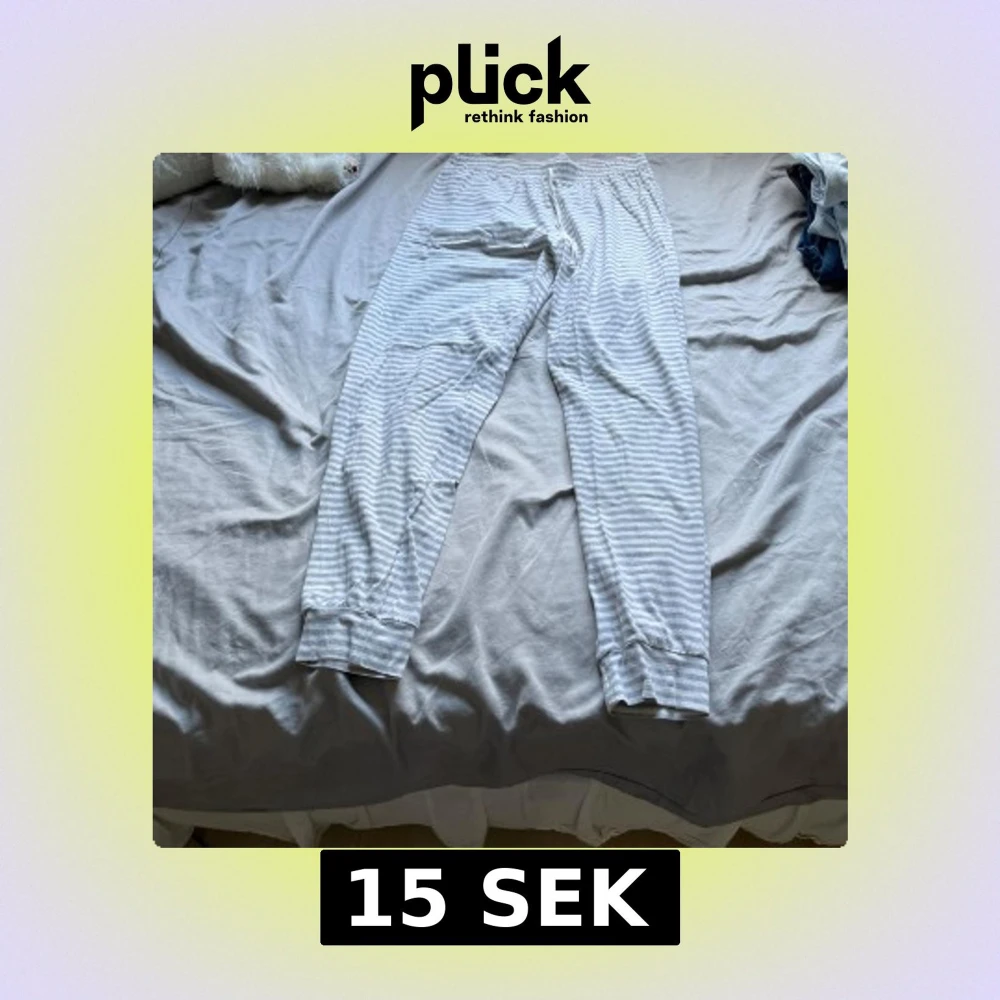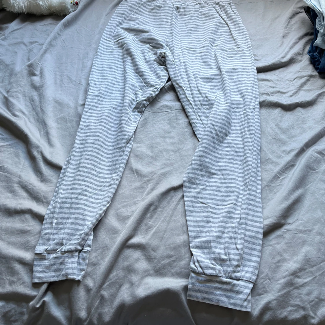 Superbekväma mjukisbyxor med gråvita ränder och muddar vid bensluten. Perfekta för chill hemma eller när du vill vara extra comfy. Resår i midjan och mjukt bomullsmaterial gör dem till ett måste i garderoben.
