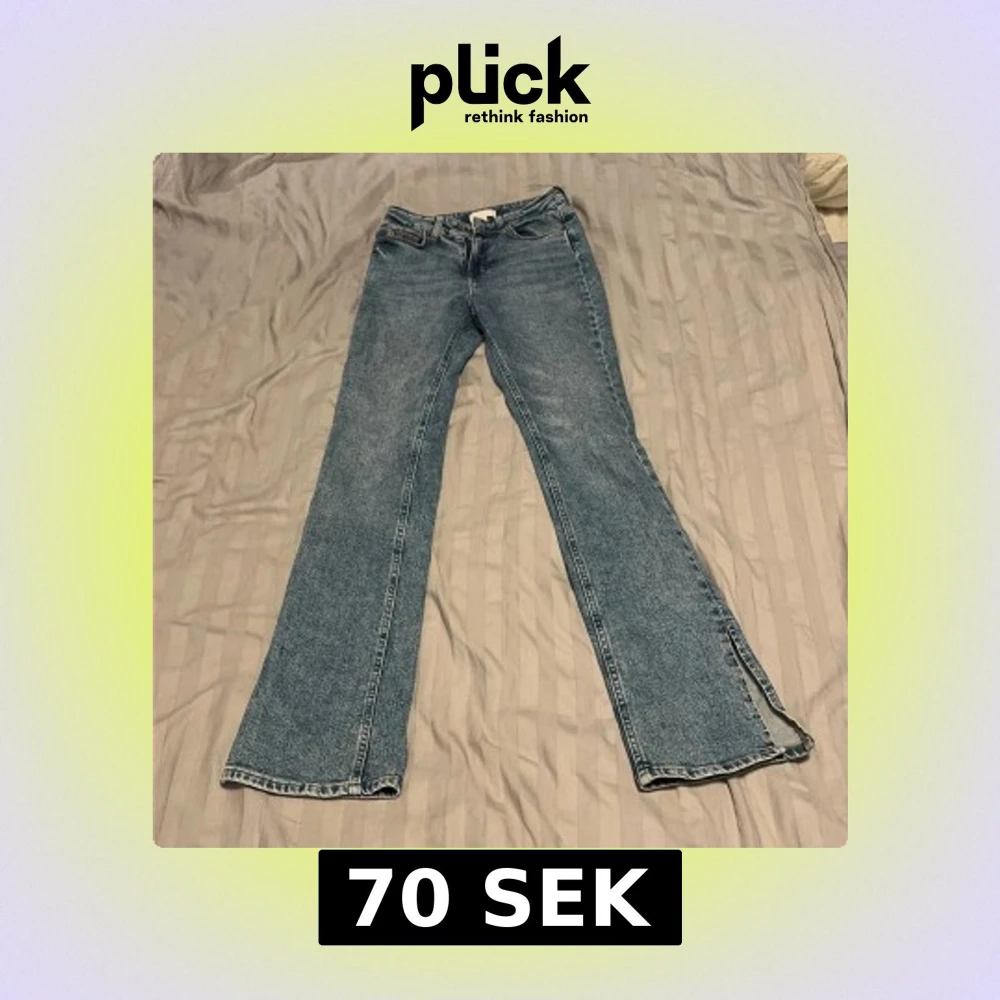 Säljer ett par klassiska blå stretchjeans med raka ben och snygg slits nertill på utsidan av benen. Jeansen har fem fickor och normal passform, perfekta för en chill och trendig look. Materialet är robust denim som håller länge.