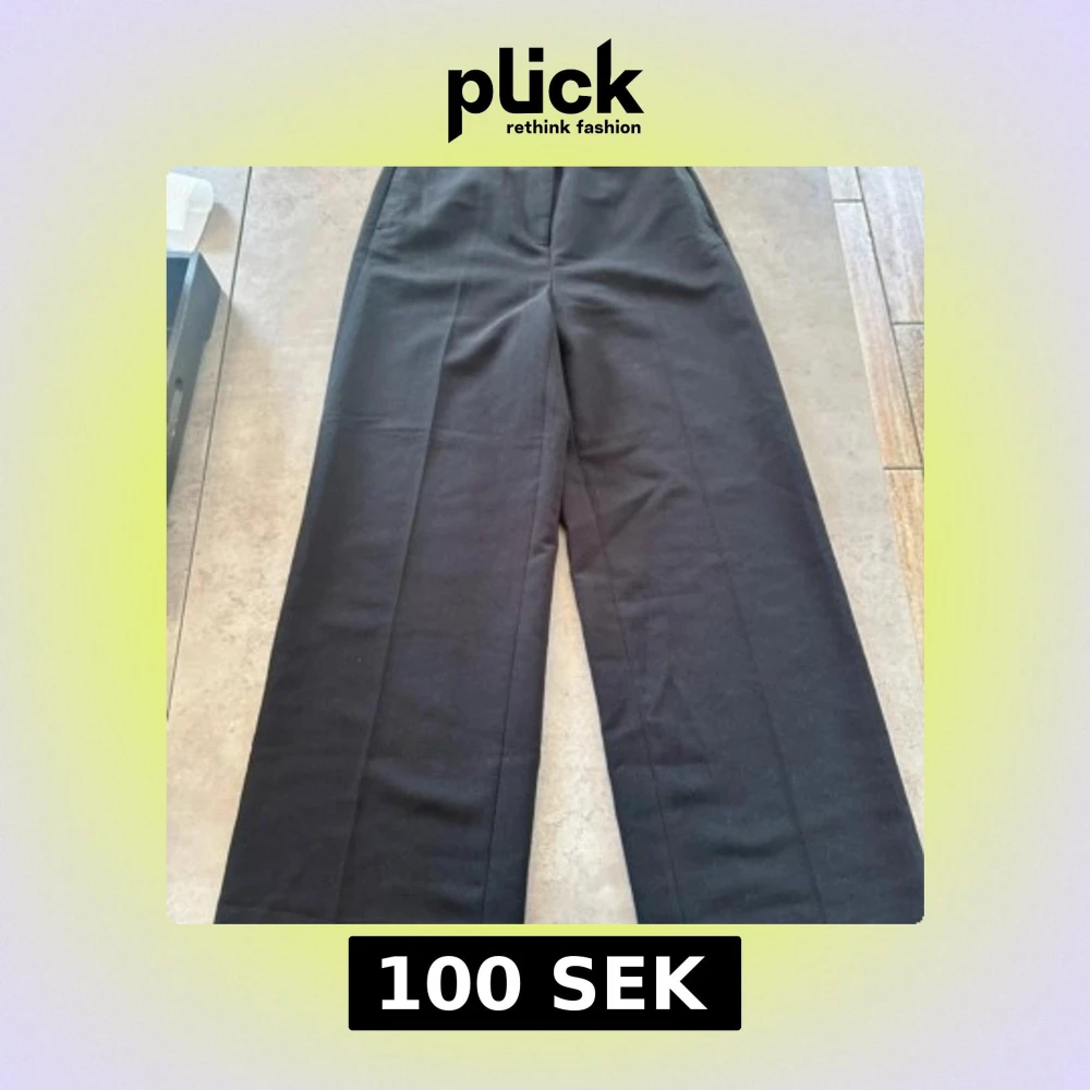 Snygga svarta kostymbyxor från H&M med klassisk rak passform och pressveck. Byxorna har hög midja och två bakfickor med knapp. Perfekta för en clean och stilren look. Materialet är mjukt och känns bekvämt mot huden.