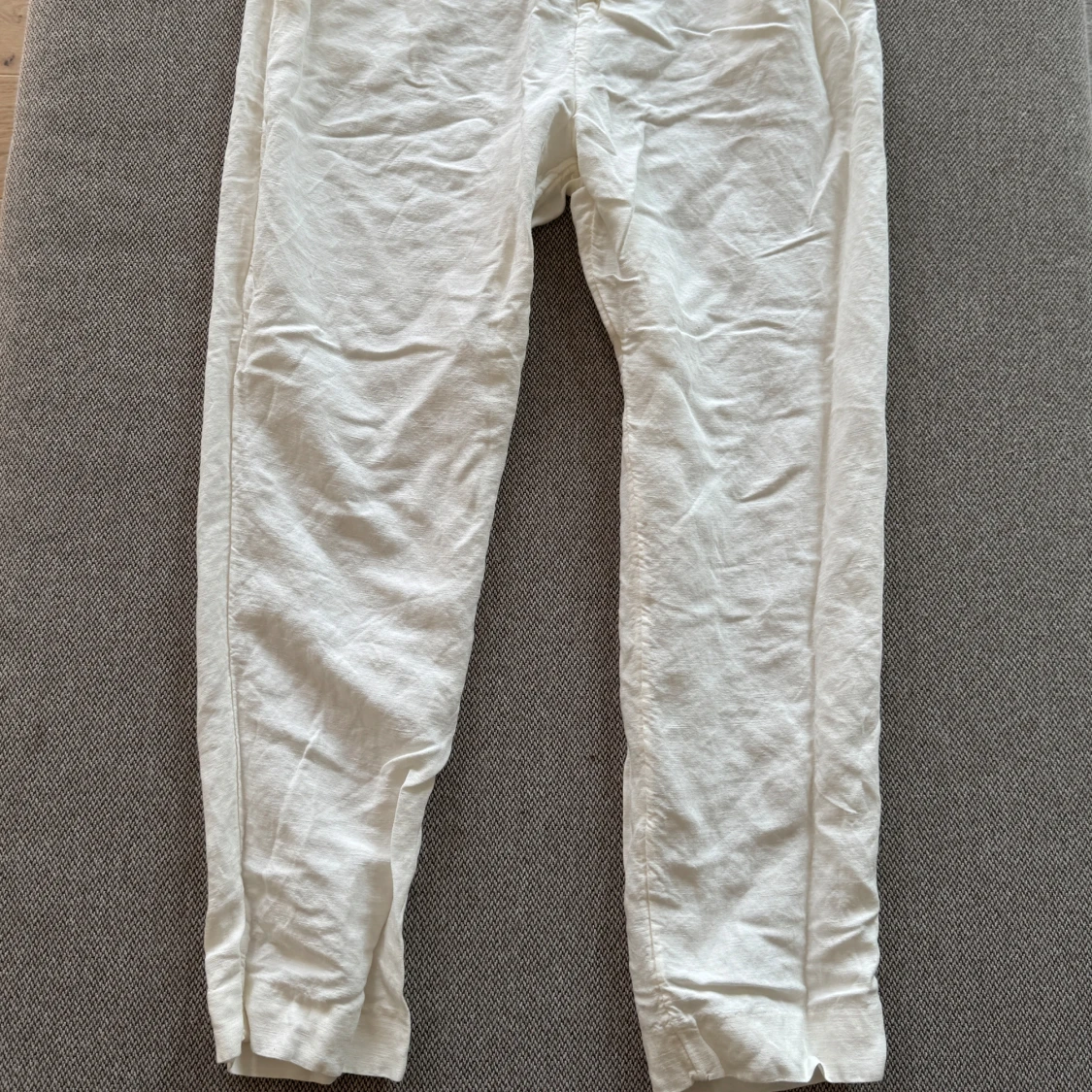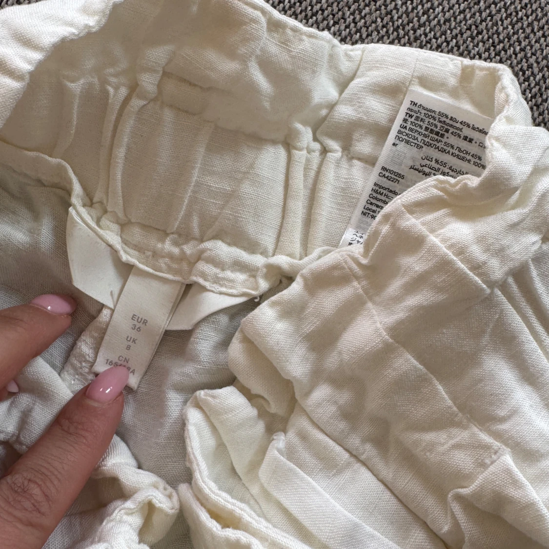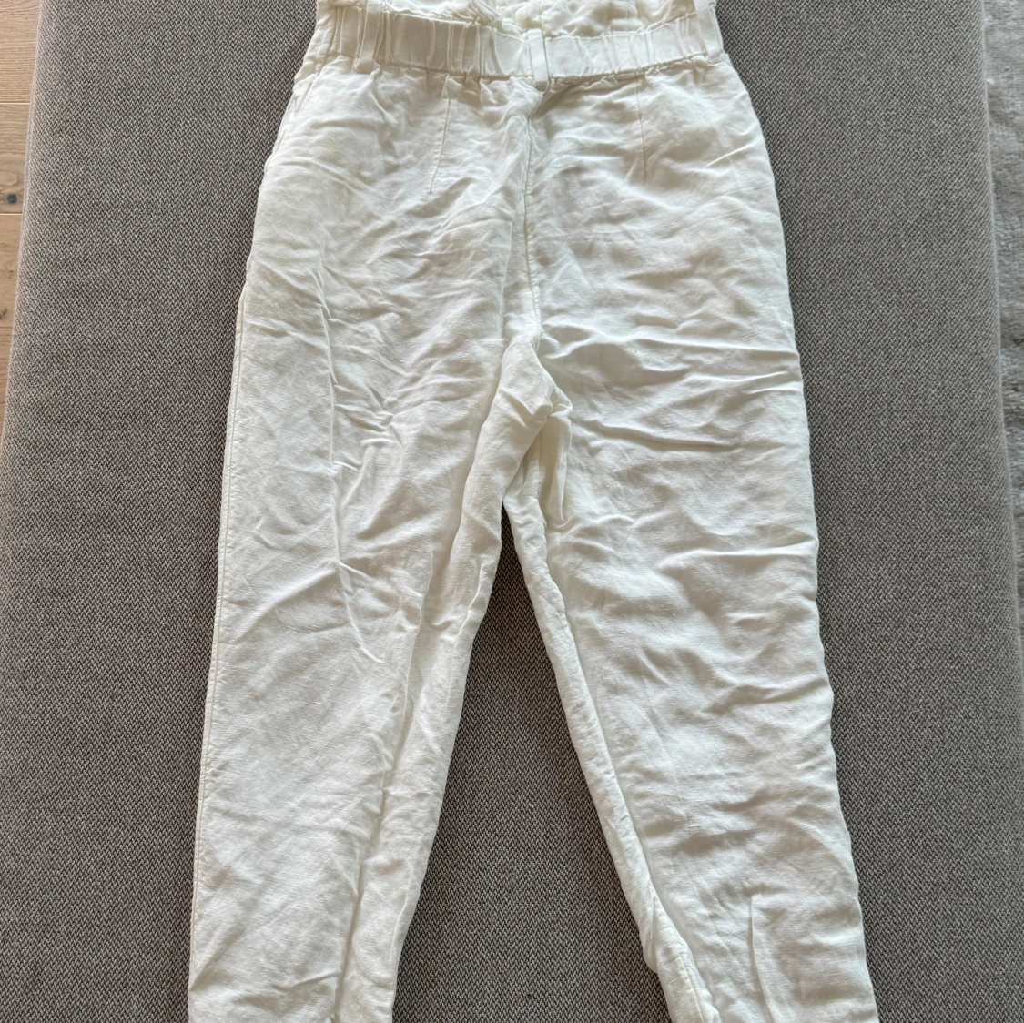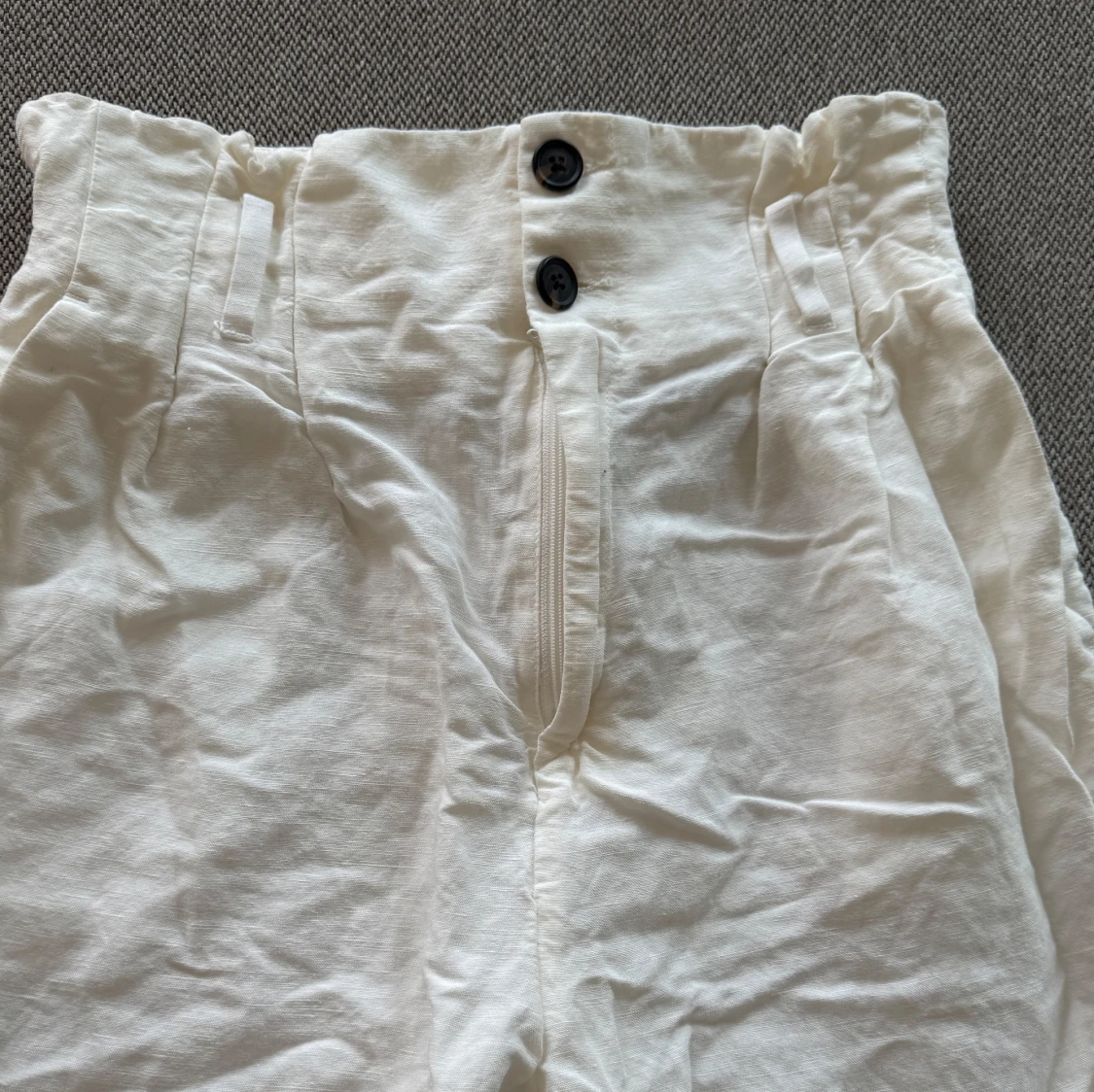 Säljer ett par vita byxor med hög midja och papperspåse-linning. Byxorna har två knappar framtill och diskreta fickor i sidorna. De är perfekta för varma dagar. Skärp saknas. Storlek 36