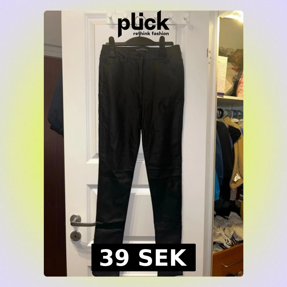 Svarta coated byxor från First Class Collection i storlek 36. Byxorna har en slim passform, klassisk femficksdesign och dragkedja med knapp. Materialet har en lätt glansig finish som ger en cool look.
