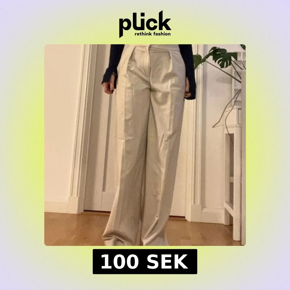 Snygga beige kostymbyxor från Hm med hög midja och vida ben. Lite för långa för mig så jag har bara använt dem någon gång. Jätte fina med inga defekter! Skriv om du har några fler frågor!