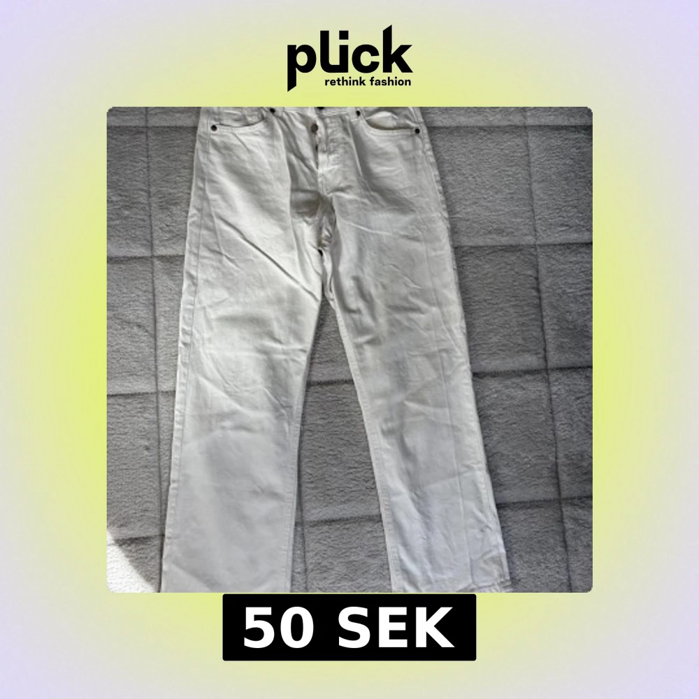 Vita jeans från H&M med raka ben och hög midja. Klassisk femficksmodell med knappgylf och silverfärgade knappar. Tillverkade i bomullstyg. Säljes billigt trots att de endast är sparsamt använda pga små stänkfläckar på baksida vaderna. 🤍