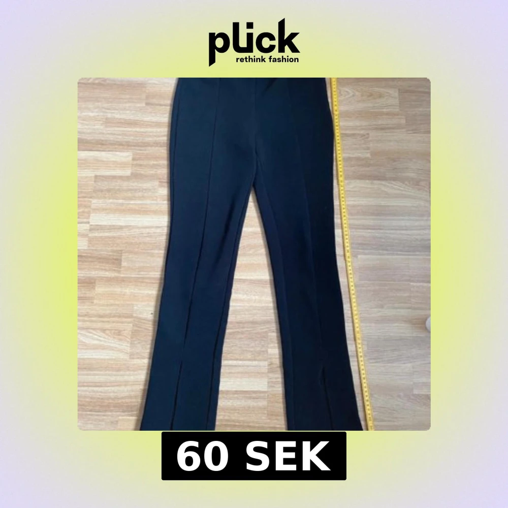 Eleganta svarta kostymbyxor med normalhög (29 cm) midja och en smickrande tajt passform. Resår i midjan som mäter 4,5 cm. Byxorna har en subtil slitsdetalj (18,5 cm) nedtill i båda benen som ger en modern touch. Perfekta för både vardag och fest. Tvättrådslappen är bortklippt. Därav är min troliga gissning att materialet är polyester. Annars inga defekter.