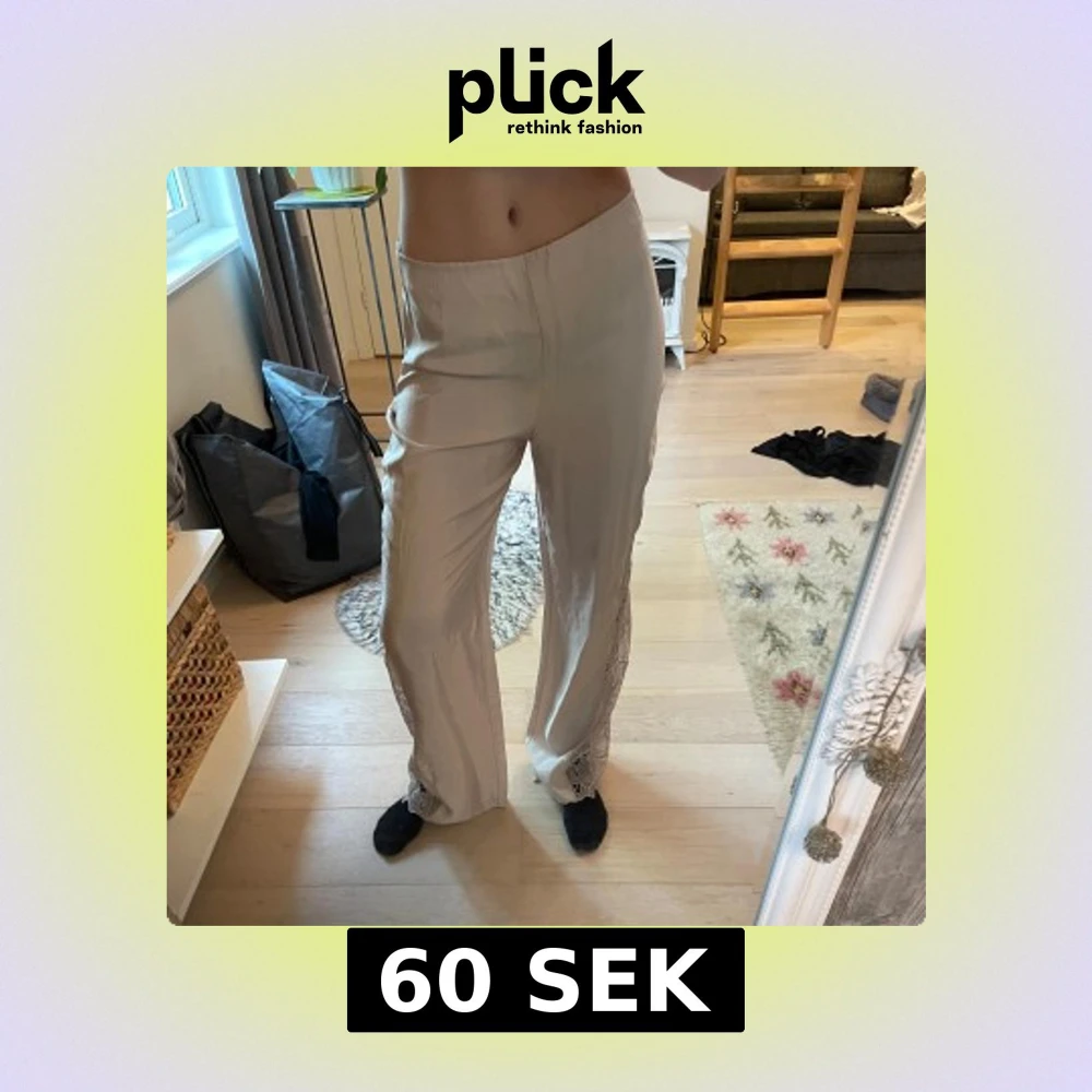 Snygga beiga byxor från H&M i storlek 38. Vida ben med breda spetsinslag längs sidorna som ger en unik och trendig look. Byxorna är tillverkade i ett lätt, glansigt material som känns lyxigt och skönt mot huden. Perfekta för dig som vill sticka ut lite extra.