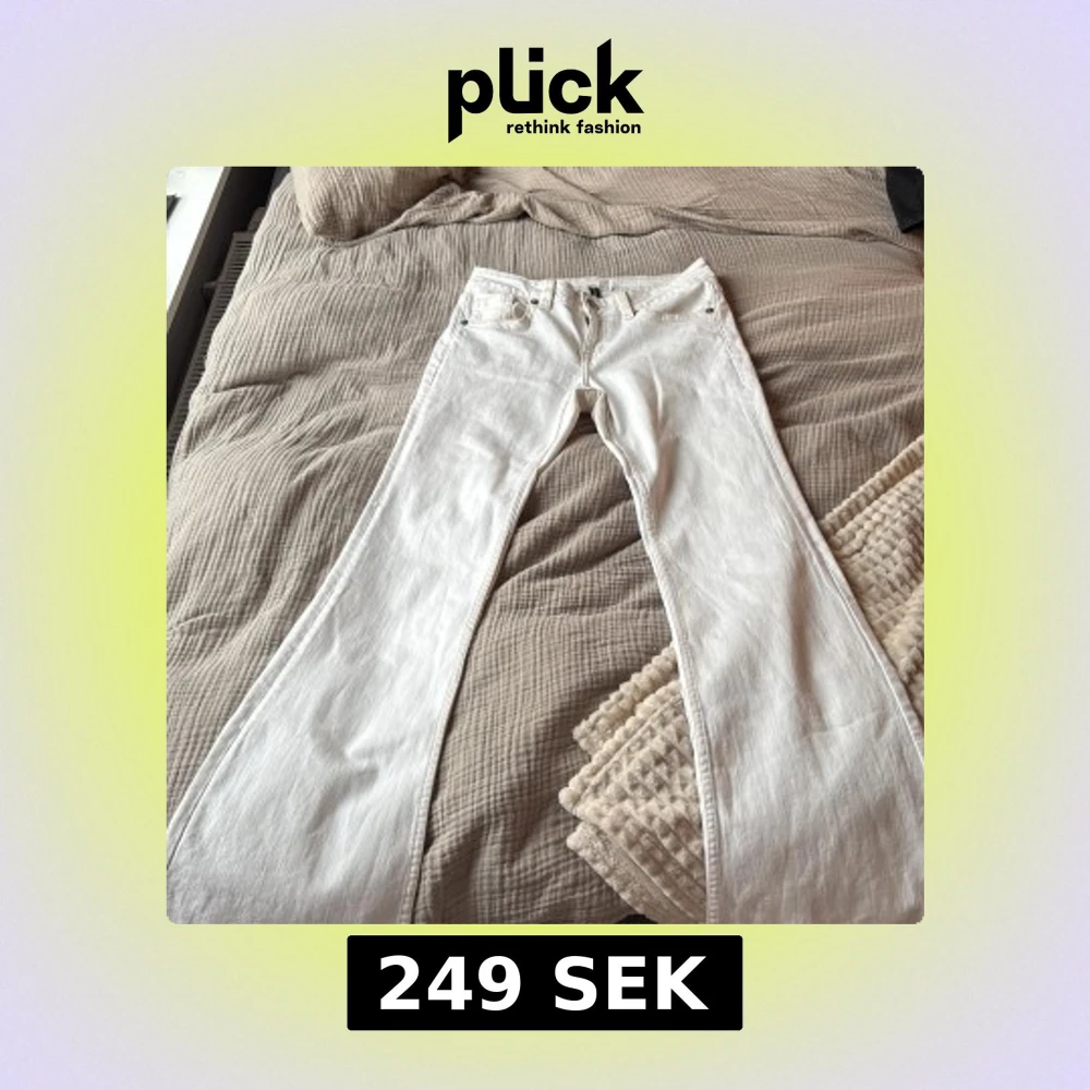 Snygga vita jeans från H&M med bootcut-modell och guldiga knappar. Byxorna har klassiska fem fickor och är tillverkade i ett mjukt bomullstyg. Perfekta för dig som vill ha en clean och fräsch look med lite extra edge.