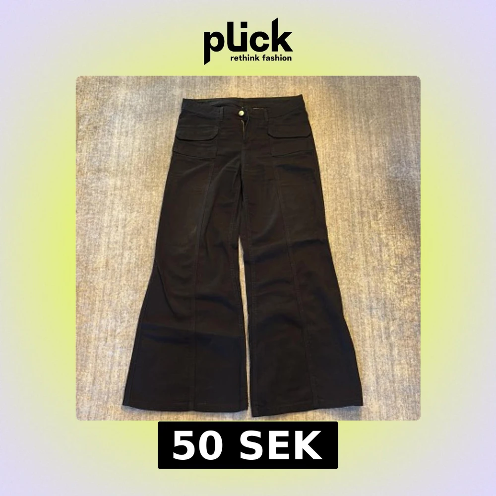 Snygga lågmidjade svarta byxor med breda ben och stora fickor framtill. Byxorna har låg midja och stängs med knapp och dragkedja. Perfekta för dig som gillar en avslappnad men trendig look. OBS! En liten smink fläck som syns på bilden, inte jätte synlig.