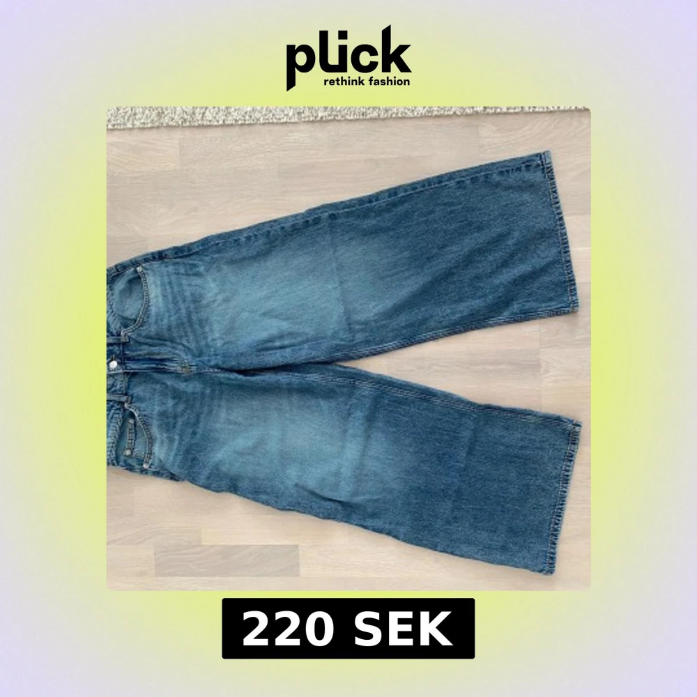 Säljer ett par blåa wide jeans från H&M i storlek 38. Jeansen har låg midja, klassisk femficksdesign och riktigt breda ben. Materialet är en mix av bomull och återvunnen bomull samt tencel. Perfekta för en avslappnad och trendig look.