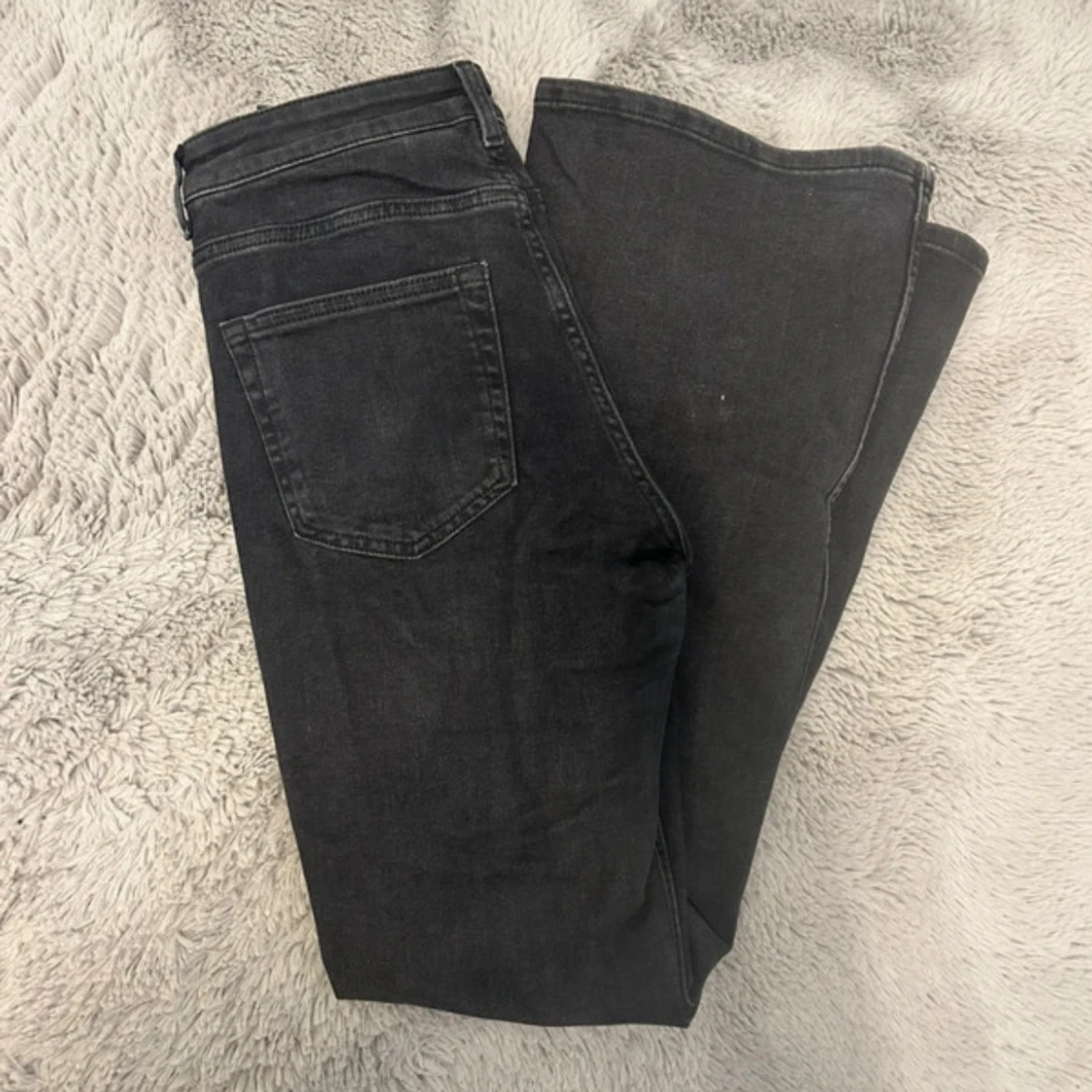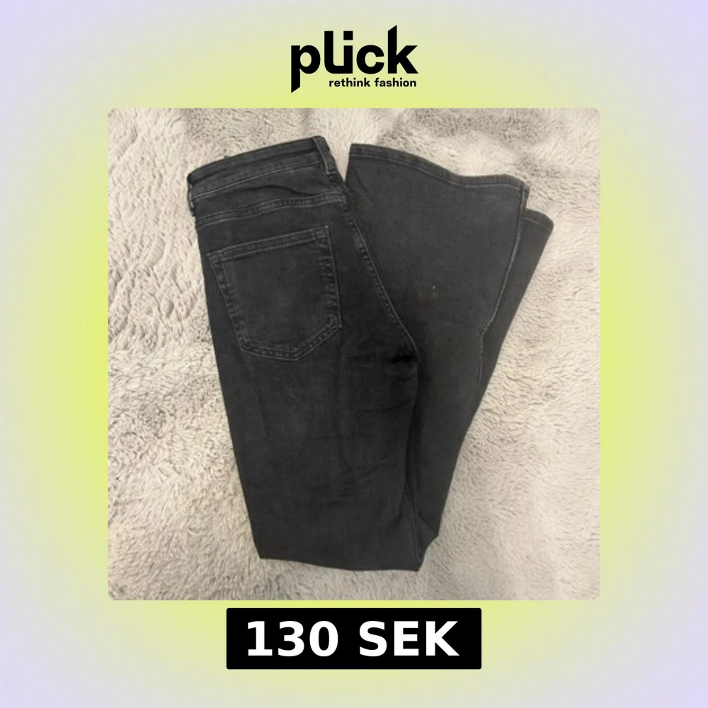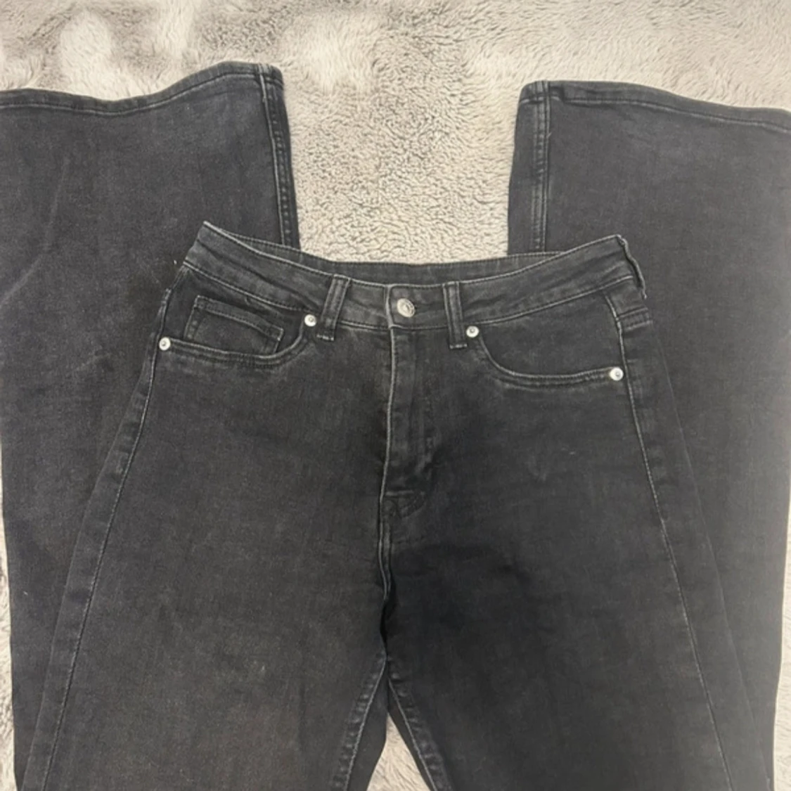 Snygga svarta jeans med klassisk femficksdesign och utsvängda ben. Jeansen har normalhög midja och är tillverkade i ett mjukt denimtyg som sitter skönt hela dagen. Perfekta för dig som gillar en enkel och stilren look. De är använda endast två gånger. Som nya.