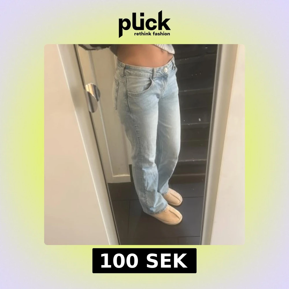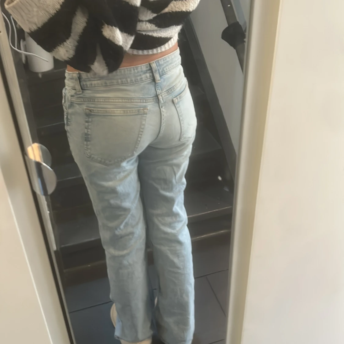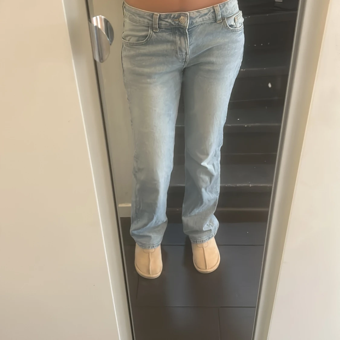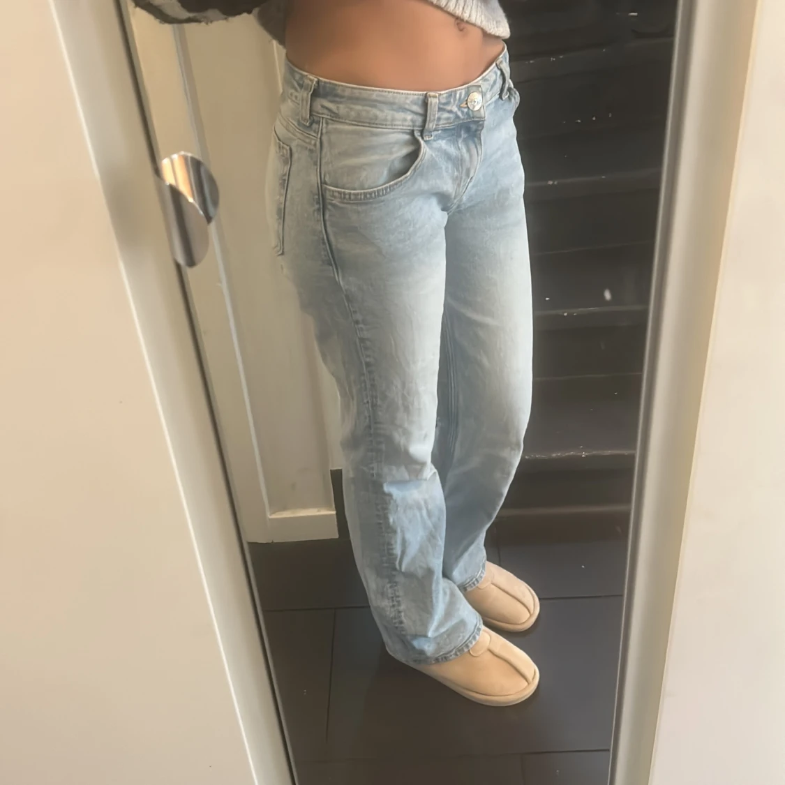 Säljer ett par ljusblå jeans med låg midja. Jeansen har raka ben och en chill passform som sitter snyggt över höften. Perfekta för dig som gillar en avslappnad stil och vill ha ett par jeans som funkar till sneakers.