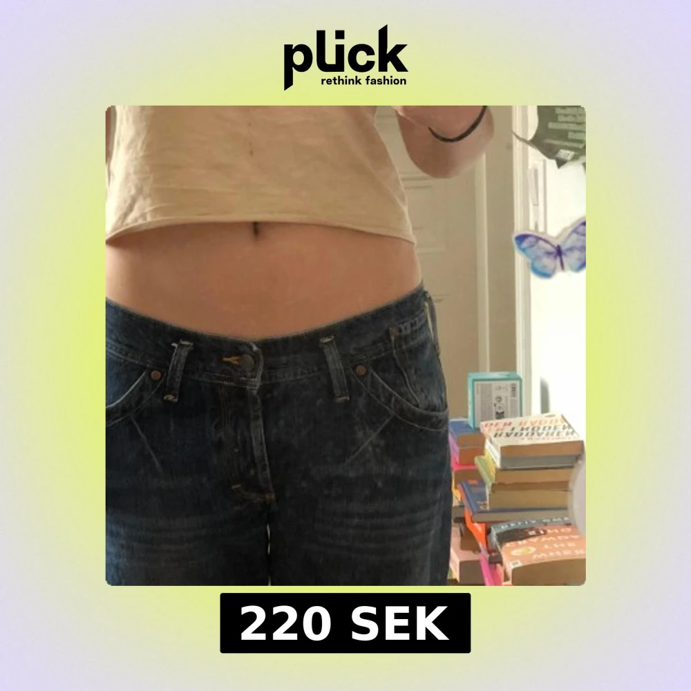 Klassiskt mörkblå jeans med raka ben och knäppning med knappar. Jeansen har fem fickor och en något lösare passform. Snygga slitningar och detaljer i gul söm. Perfekta för en avslappnad stil. De är Baggy och lågmidjade men inte så stretchiga. Köpte secondhand och lappen med storlek är tyvärr avklippt. Det är märket Divided.