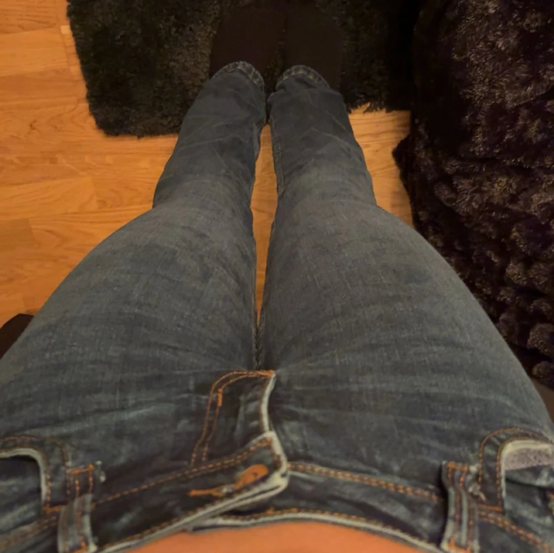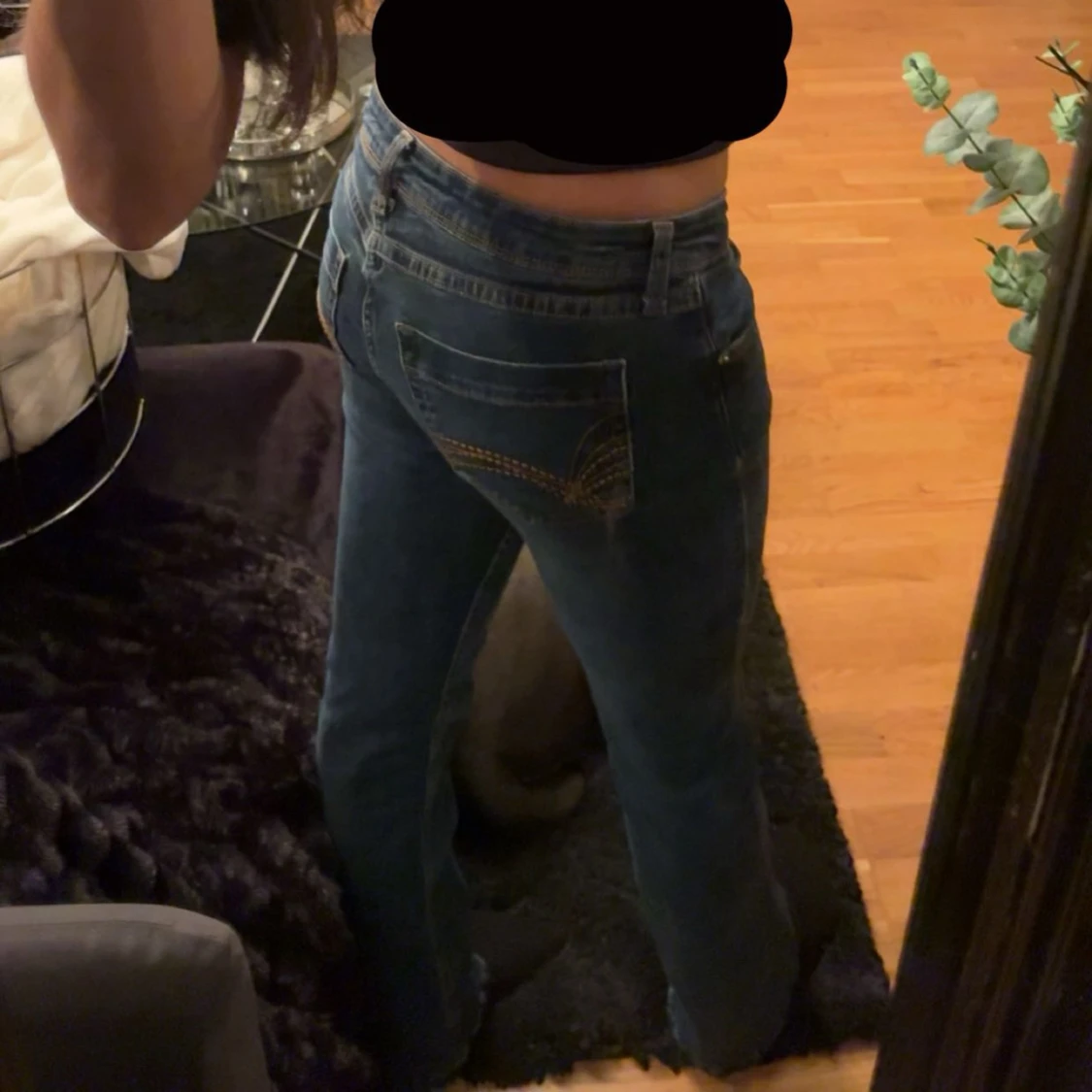 Säljer ett par mörkblåa jeans me bootcut och snygga detaljer på bakfickan. Jeansen har låg midja och är i ett mjukt denimtyg med lite stretch. Perfekta för dig som gillar en tidlös look och vill ha ett par jeans som sitter skönt hela dagen.