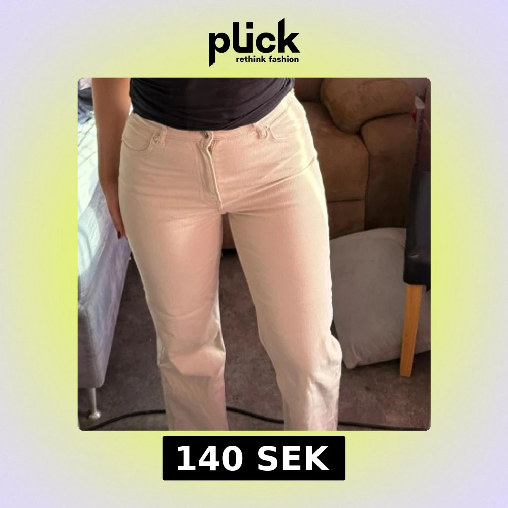 Helt nyya snygga beige jeans med hög midja och en klassisk femficksdesign. De har en rak passform och stängs med dragkedja och knapp. Perfekta för en stilren look.