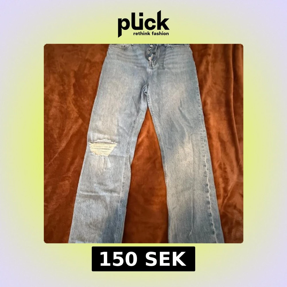 Säljer ett par blå jeans från H&M i rak modell med hög midja. Jeansen har slitning på ena knät och klassiska fem fickor. Stängs med knappar framtill.