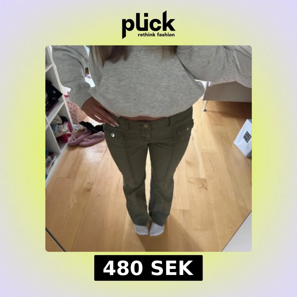 Säljer de populära hm jeansen! Byxorna är lågmidjade och har sååå fina detaljer framtill. De är lite slitna längst ner (sista bilden). Säljer de på grund av att de inte kommer till användning!