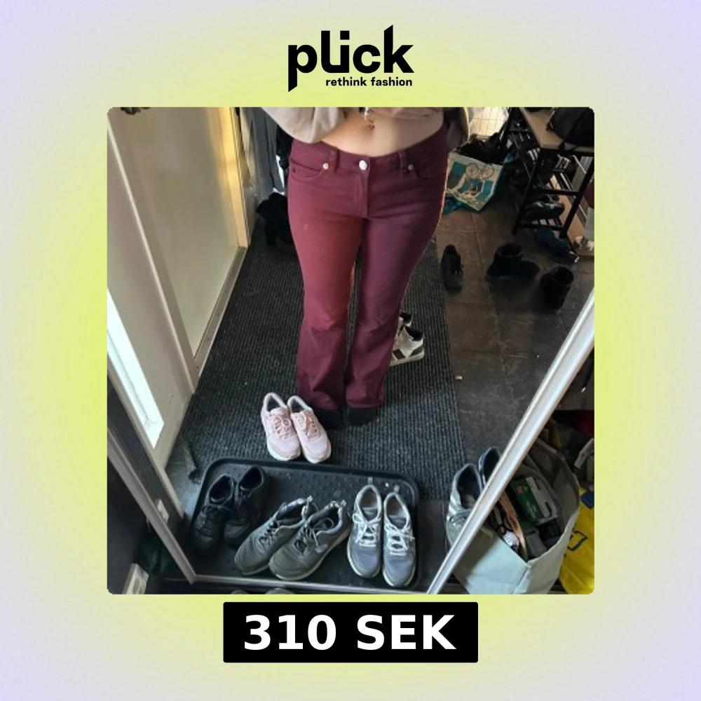 Säljer ett par vinröda jeans med bootcut-modell och klassisk femficksdesign. Byxorna har normalhög midja och är tillverkade i ett mjukt bomullstyg med lite stretch. Snygga silverspännen och detaljer. Perfekta för dig som vill ha en cool och trendig look. Storlek 40 men skulle säga att dom passar 38 med