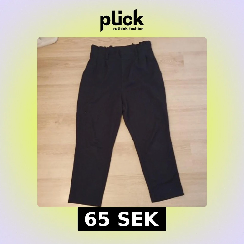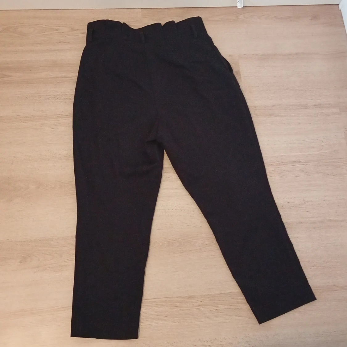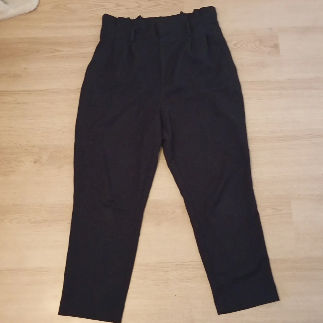 Snygga svarta kostymbyxor med hög midja och raka ben. Byxorna har bälteshällor och en lite papperspåse-liknande midja som ger en trendig look. Perfekta att styla med en crop top eller stickad tröja.