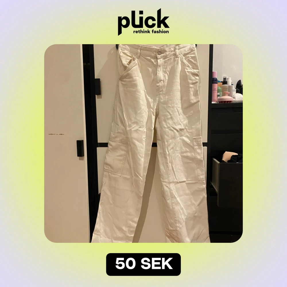 Säljer ett par vita/krämvit cargopants i bra skick. De har en loose passform och är perfekta för en avslappnad stil. Byxorna har flera praktiska fickor och är gjorda i ett slitstarkt material. Perfekta för vardag. De är skrynkliga eftersom de länge legat i garderoben men med lite strykning sitter de som en smäck!