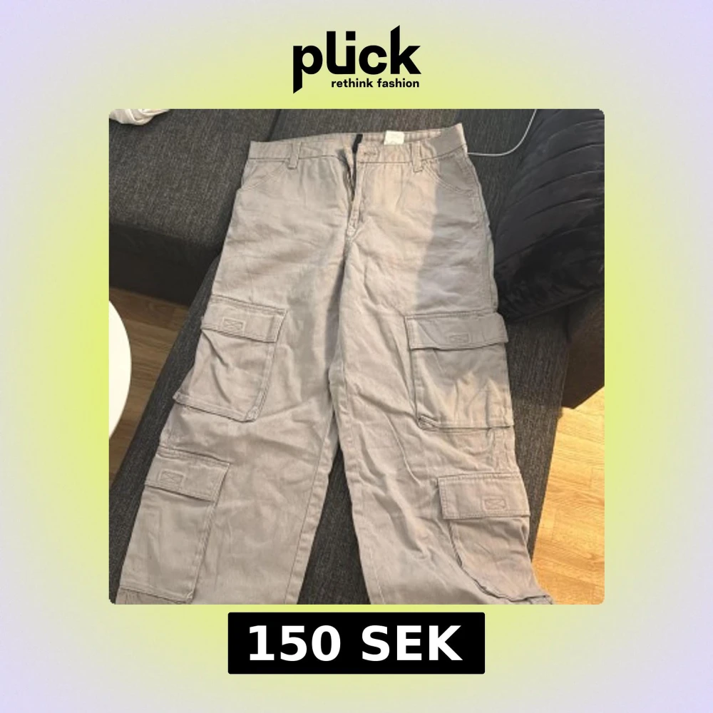 Säljer ett par grå cargobyxor med flera stora fickor på sidorna. Byxorna har en rak passform. Perfekta för en avslappnad och trendig stil.