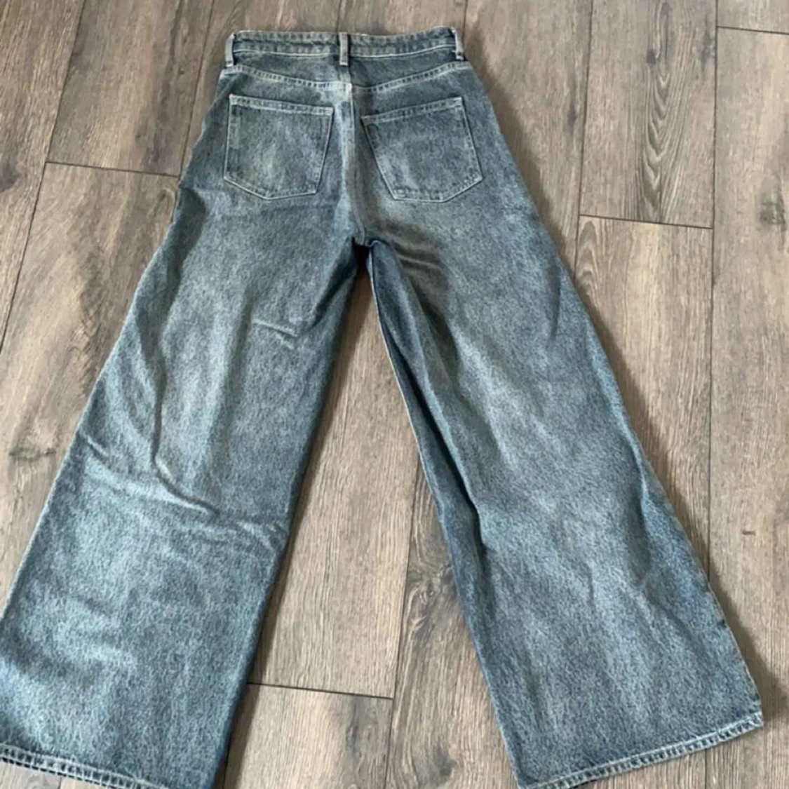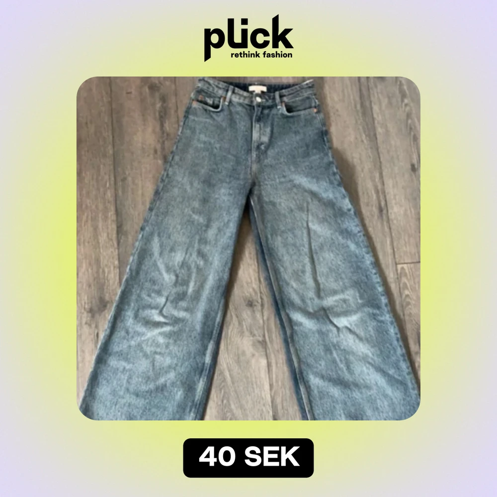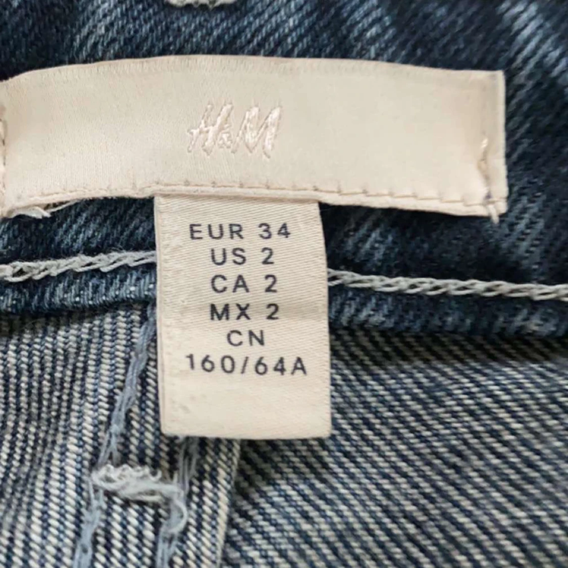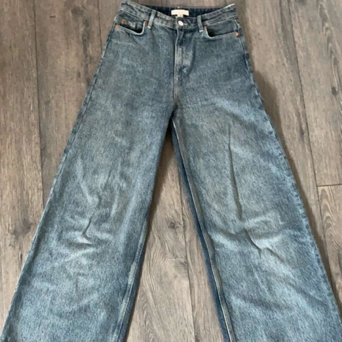 Ett par blå jeansbyxor från H&M i storlek EUR 34. Byxorna har en hög midja och en vid passform. De är tillverkade i ett klassiskt jeansmaterial och har fickor både fram och bak.