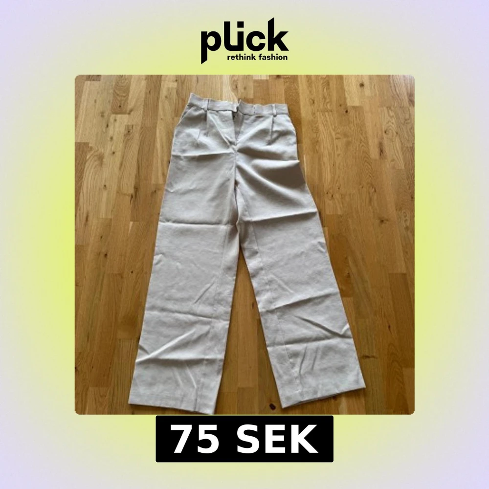Säljer ett par beige byxor med vida ben och hög midja. Byxorna har resår baktill i midjan och stängs med dragkedja och knapp framtill. Perfekta för en avslappnad och stilren look.