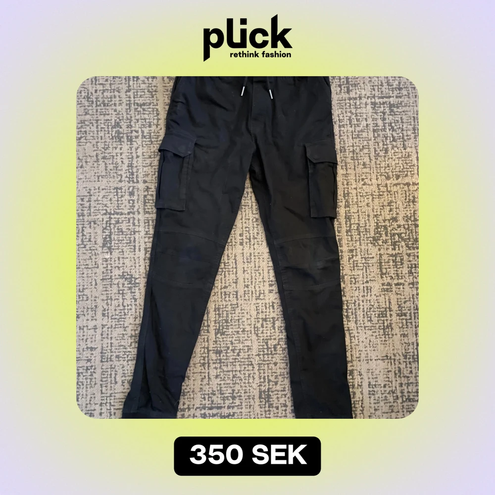 Säljer ett par svarta cargobyxor från H&M i storlek S. Byxorna har flera praktiska fickor och en bekväm dragsko i midjan. Perfekta för en casual look eller en dag ute i naturen. De är i bra skick och redo för nya äventyr!