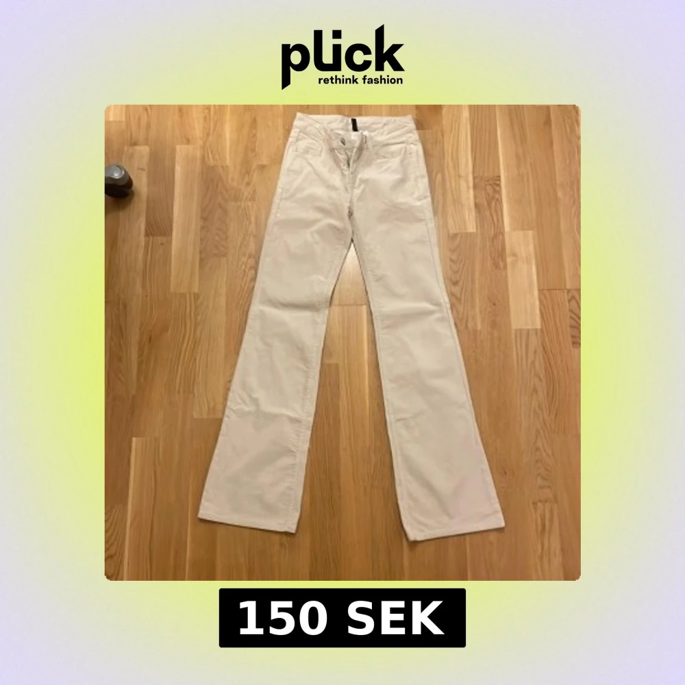 Snygga beige byxor från H&M i bomull med en liten del elastan för extra komfort. De har en rak passform och är perfekta för en stilren look. Byxorna har knappar och dragkedja framtill.