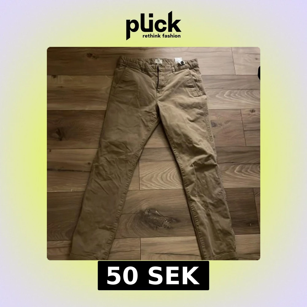 Snygga beige chinos från H&M med en klassisk design. De har en normal passform och är tillverkade i bomull. Byxorna har sidofickor och bakfickor med knappar. Perfekta för en stilren look.