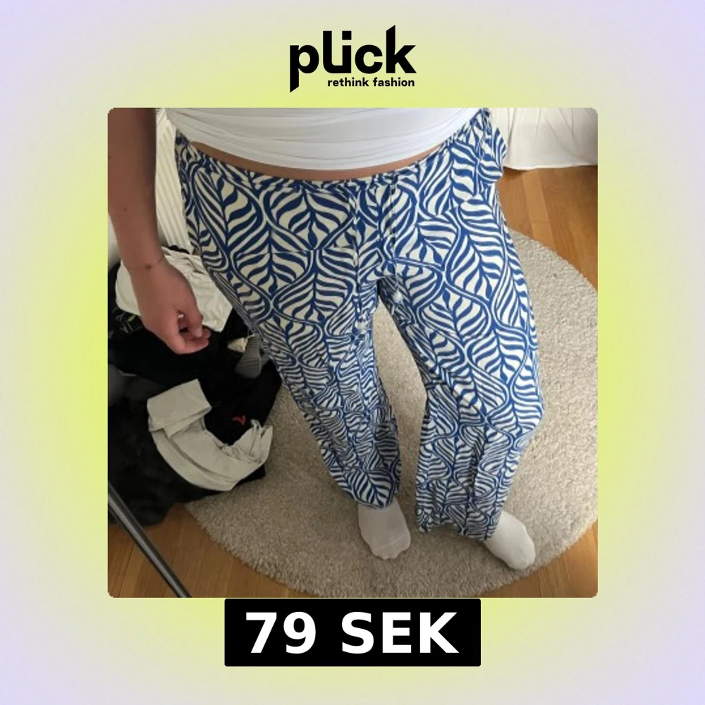Säljer ett par blåvita byxor med ett coolt grafiskt mönster som påminner om blad eller zebra. Byxorna har en loose och wide passform med rak siluett och elastisk midja. Perfekta för dig som gillar att sticka ut med färg och mönster.