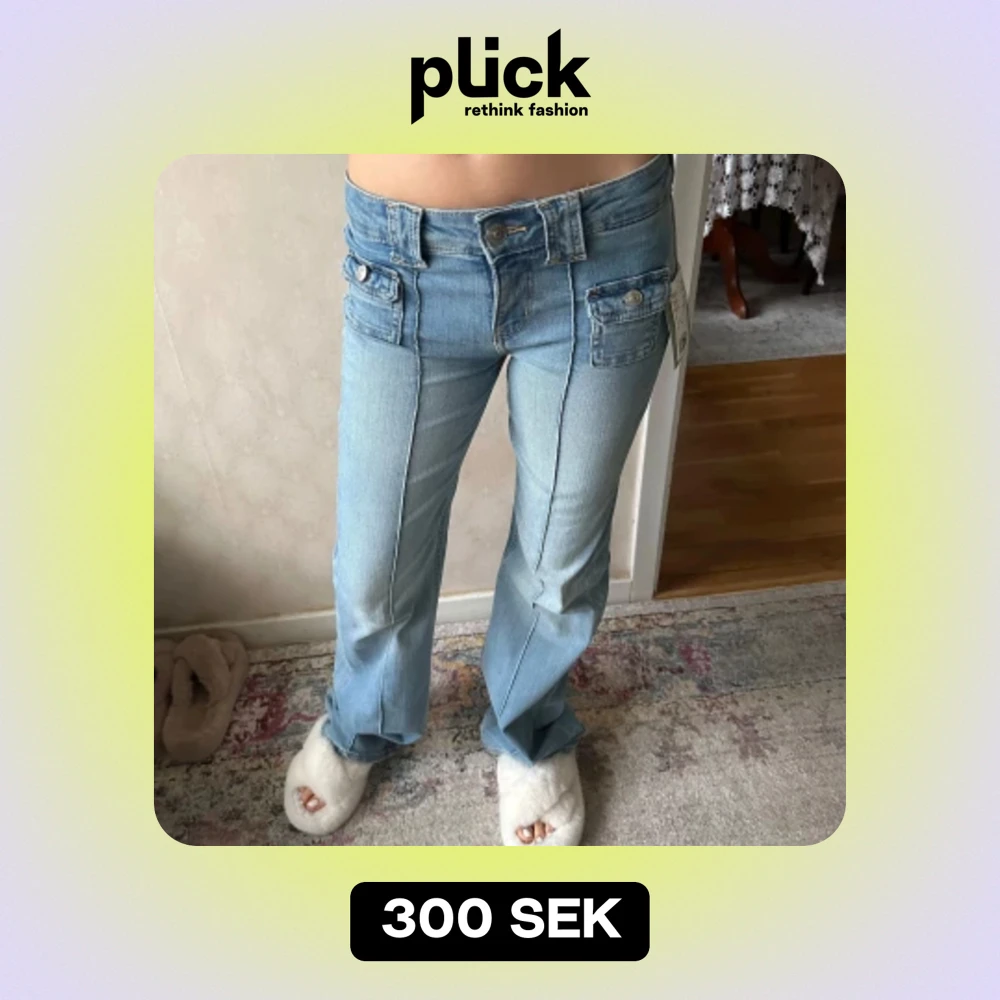 slutsålda ljus blåa low waisted flare hm jeans med fickor och fin design ( skriv ifall ni har några funderingar )