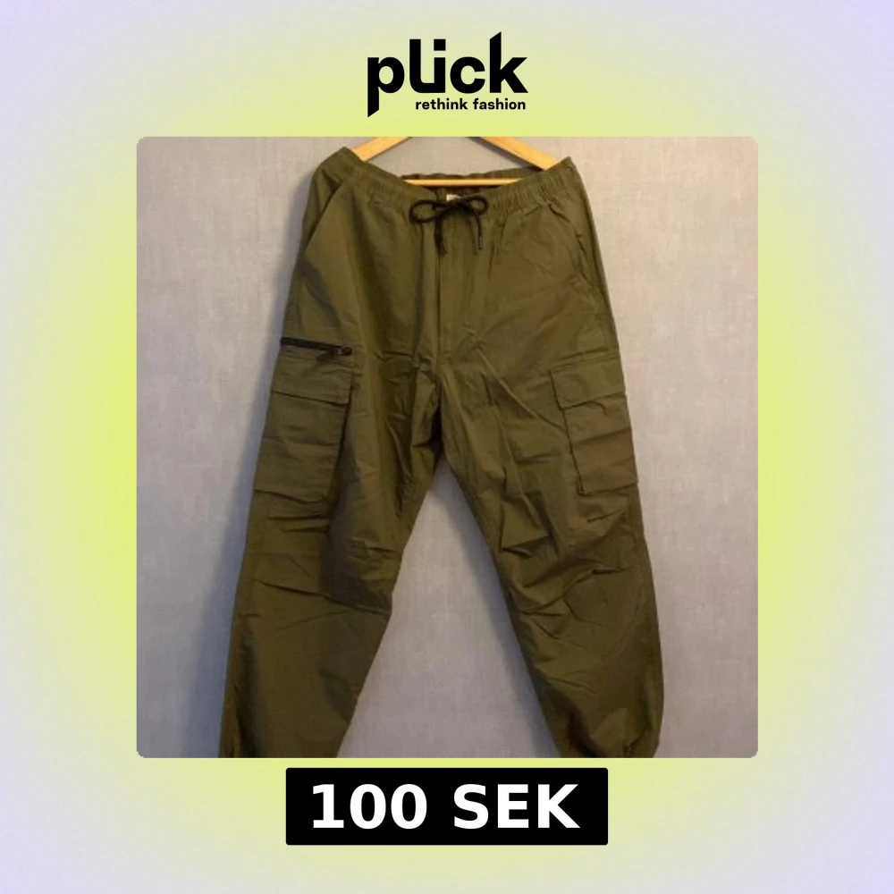 Säljer ett par olivgröna cargobyxor från H&M i relaxed fit. Byxorna har flera fickor, snörning i midjan och justerbara benslut. Perfekta för en chill och avslappnad stil. Materialet känns lätt och smidigt, och de har en loose passform.