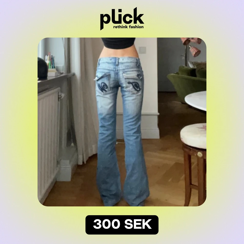 Supersnygga lågmidjade bootcut jeans som är väldigt unika och coola i perfekt skick. Supersnygg wash och coola fickor med broderier på. Köptes vintage. Skriv om ni undrar något💗HÖGSTA BUD LIGGER PÅ 370. Köp direkt för 400