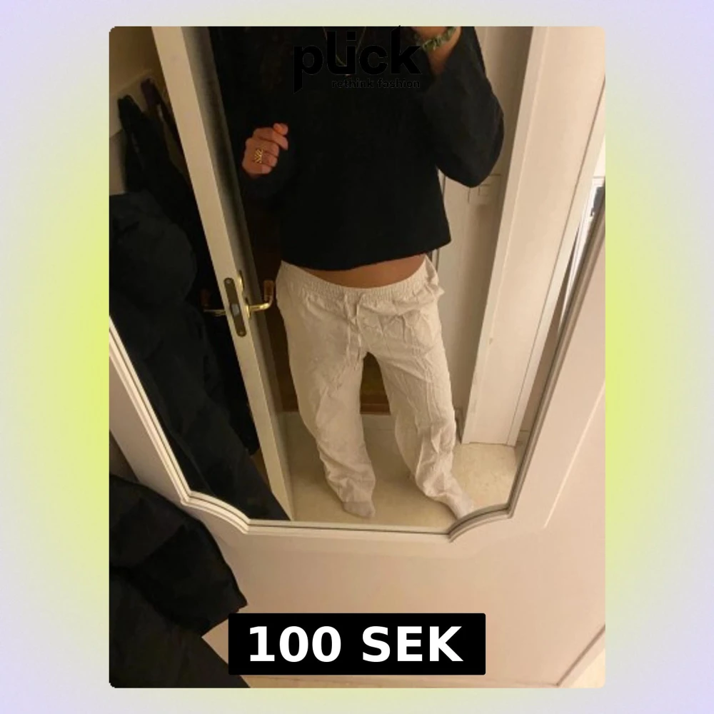 Säljer ett par linnebyxor med avslappnad passform och elastisk midja med snörning. Byxorna har raka ben och sidofickor. Materialet är lätt och luftigt linne, vilket gör dem sköna att bära.