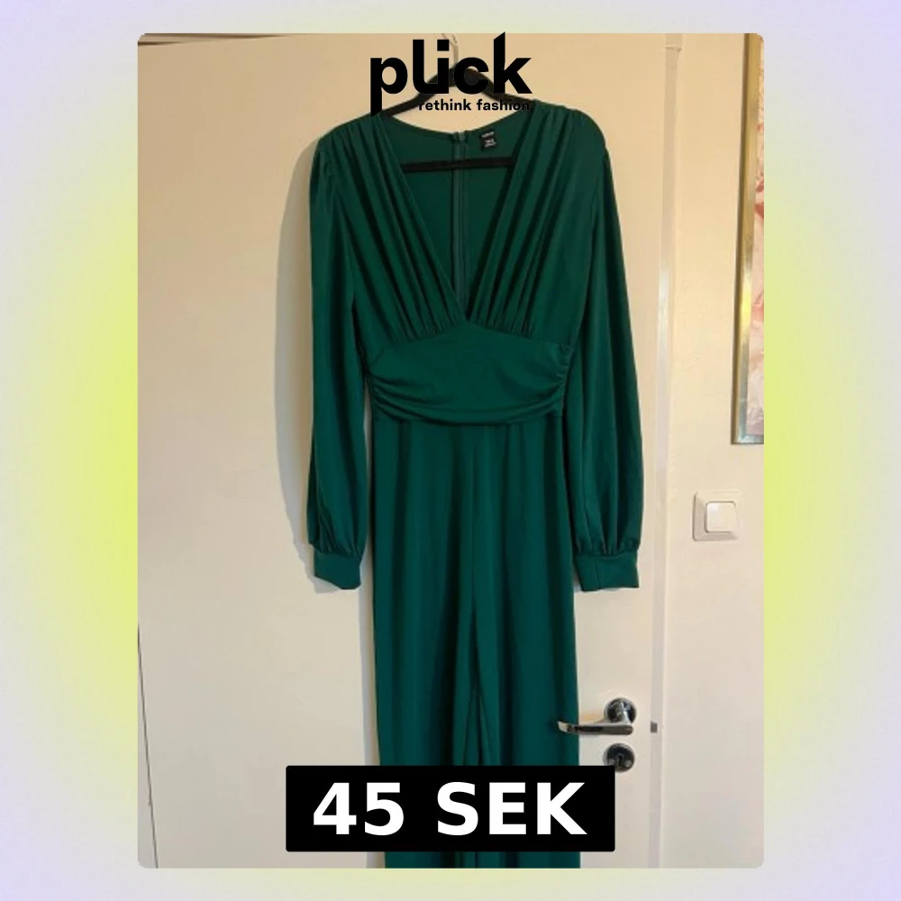Snygg grön byxdress från H&M med lång ärm och djup v-ringning. Dressen har ett markerat midjeparti och vida ben, samt dragkedja i ryggen för enkel på- och avklädning. Perfekt för dig som gillar stilrena och trendiga plagg.