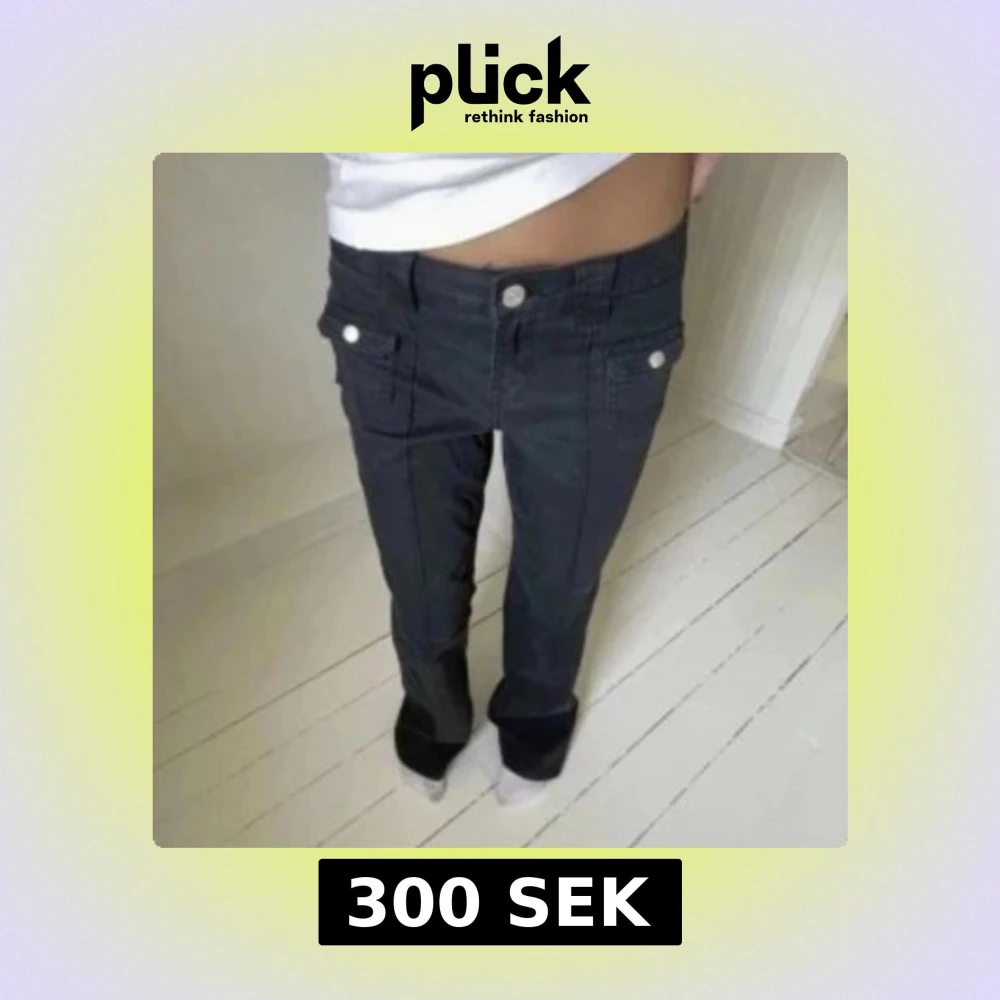 Säljer ett par svarta jeans med låg midja och bootcut-ben. Byxorna har framfickor med lock och silverfärgade knappar som ger en cool vibe. Materialet är klassisk jeans och passformen är normal. Perfekta för dig som gillar retrostil och vill sticka ut.