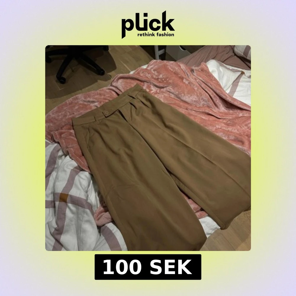 Snygga bruna kostymbyxor med klassiskt snitt och pressveck. Byxorna har låg midja, raka ben och fickor bak med lock.