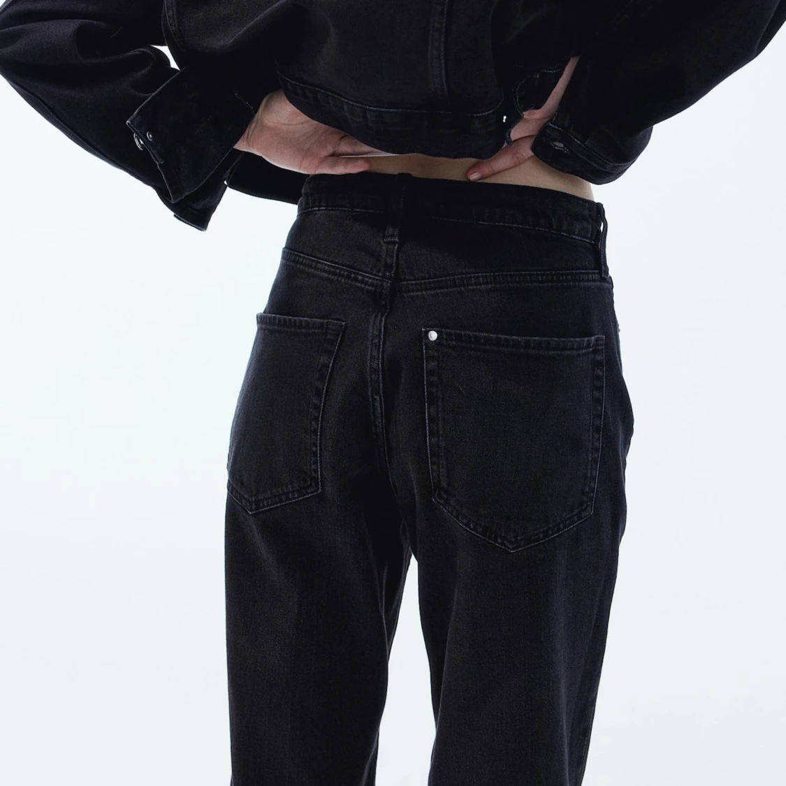 Snygga svarta jeans med hög midja och raka ben. Jeansen har klassisk femficksdesign, bälteshällor och knappgylf. Perfekta till en crop top eller hoodie för en chill look.