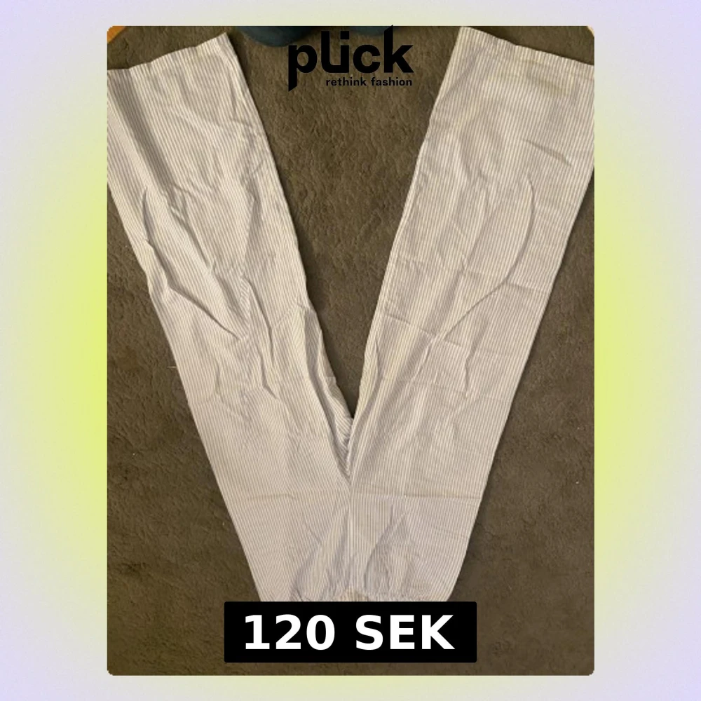 Säljer ett par ljusblå och vita pyjamasbyxor från H&M i storlek M med tillhörande pyjamaslinne med blåa band och en blå blomma på bröstet. Byxorna har smala vertikala ränder, elastisk midja och är tillverkade i mjuk bomull. Perfekta för chill hemma eller mysiga kvällar.