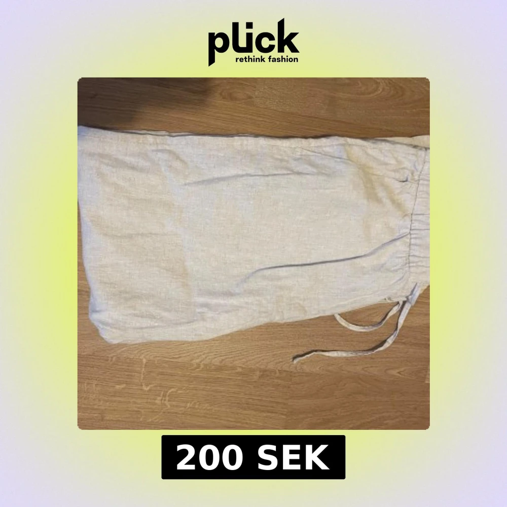 Säljer ett par ljusbeiga linnebyxor med avslappnad passform och snörning i midjan. Byxorna har raka ben och är perfekta för varma dagar. Materialet är svalt och luftigt linne, vilket ger en chill och stilren vibe.