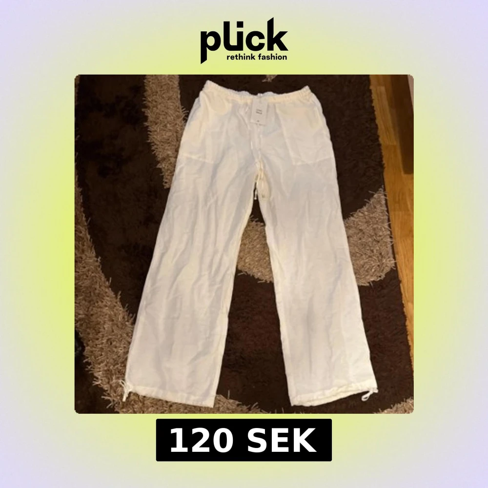 Säljer ett par luftiga vita linnebyxor med resår i midjan och dragsko vid bensluten. Perfekta för varma dagar och har en avslappnad passform. Byxorna är helt nya och oanvända därför säljs dom för samma pris jag köpte på rea alltså 120kr!