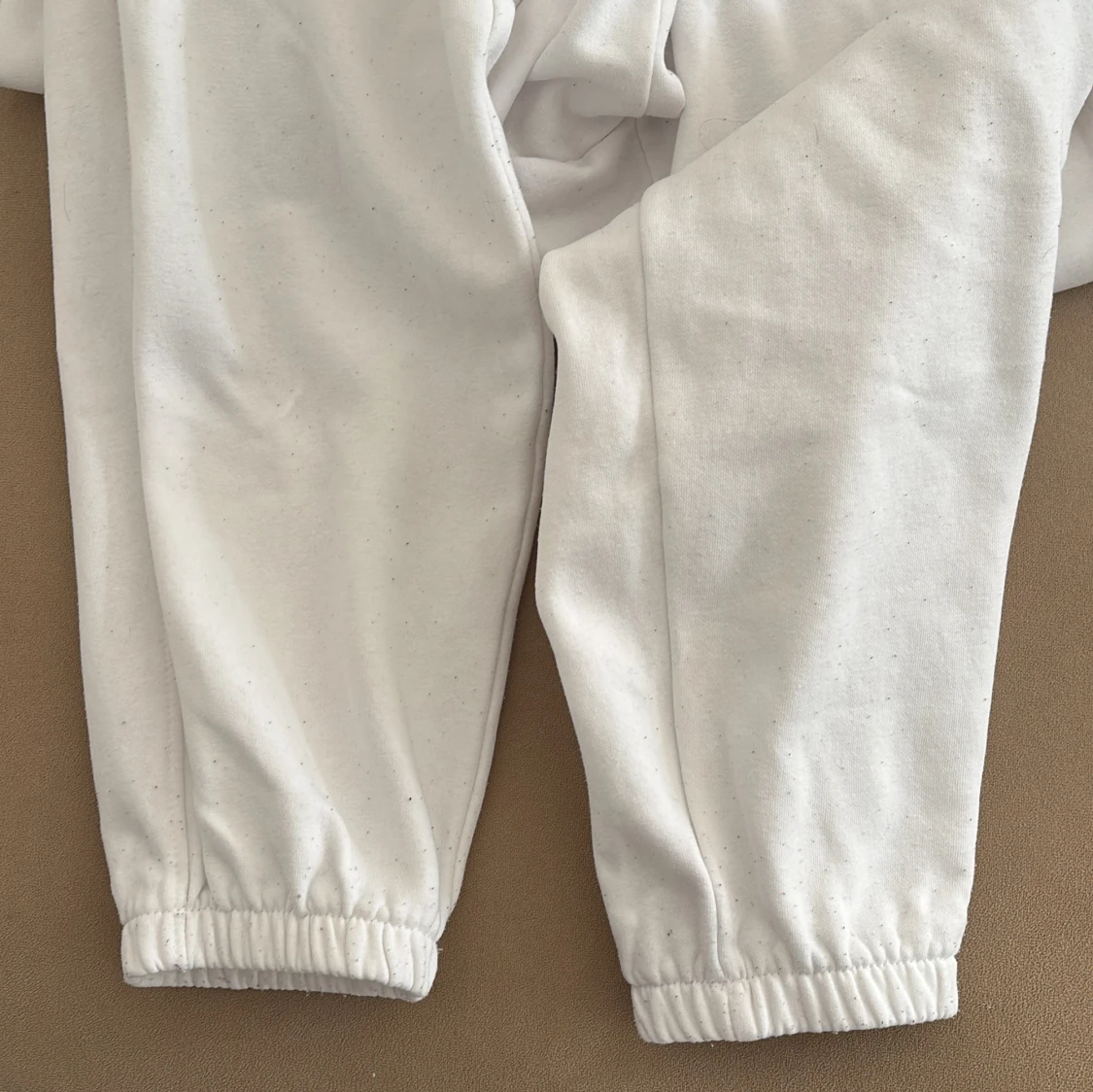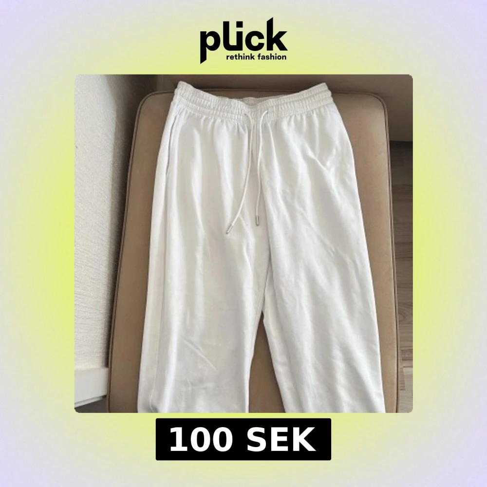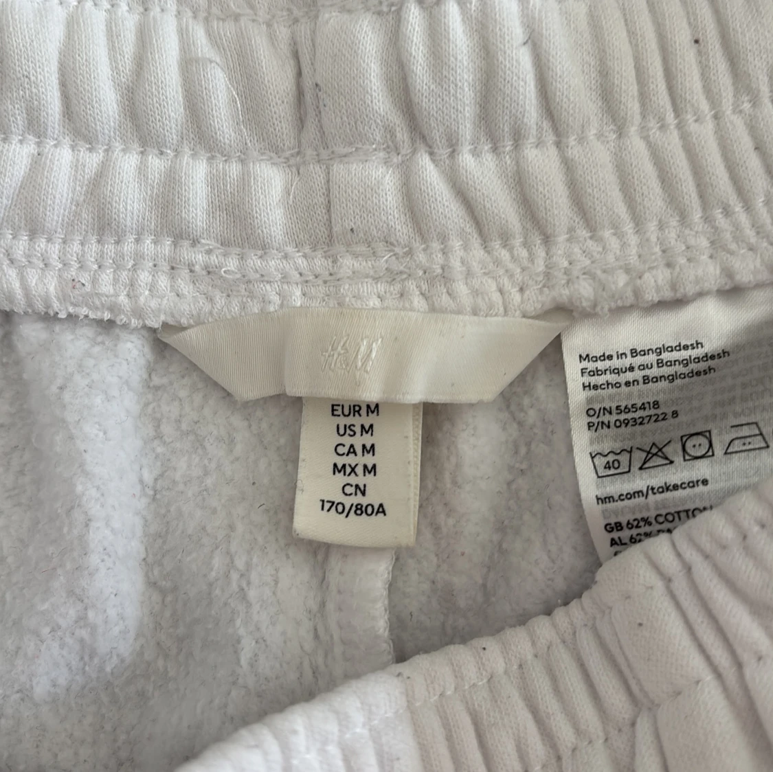 Säljer ett par vita mjukisbyxor från H&M. Byxorna har en elastisk midja med snörning och ribbade muddar vid bensluten. Perfekta för en avslappnad stil.