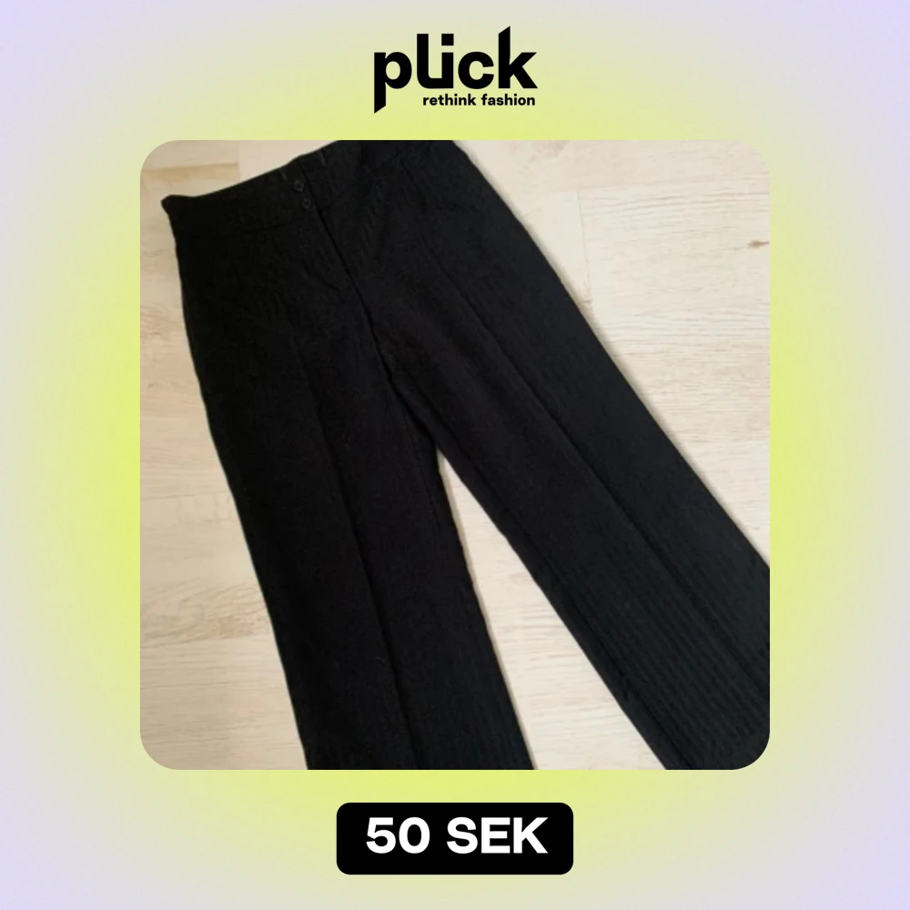 Svarta kostymbyxor från H&M. Köpta second hand men aldrig använda av mig. Byxorna är i storlek 40 men förra ägaren har sytt in dem så skulle säga att de passar M. Mid/low waist. Passar perfekt i längden på mig som är 160 ca.