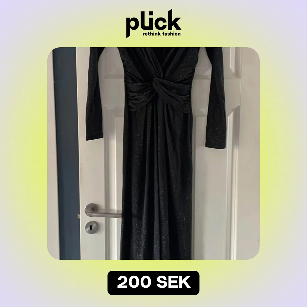 Snygg svart jumpsuit med glittrigt mönster och omlott-design. Den har långa ärmar och en elegant drapering framtill som ger en smickrande passform. Perfekt för festliga tillfällen när du vill glänsa lite extra! ✨väldigt fint skick