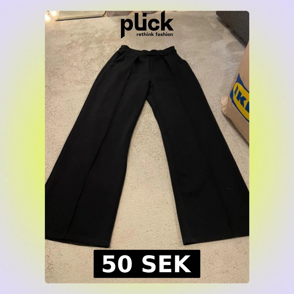Snygga svarta kostymbyxor. Resårband längst upp. Ytterbenslängd 104, innerbenslängd 76, midjemått 32. Inga skador. 💕